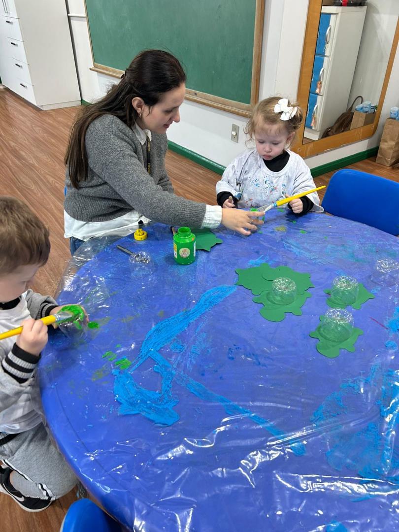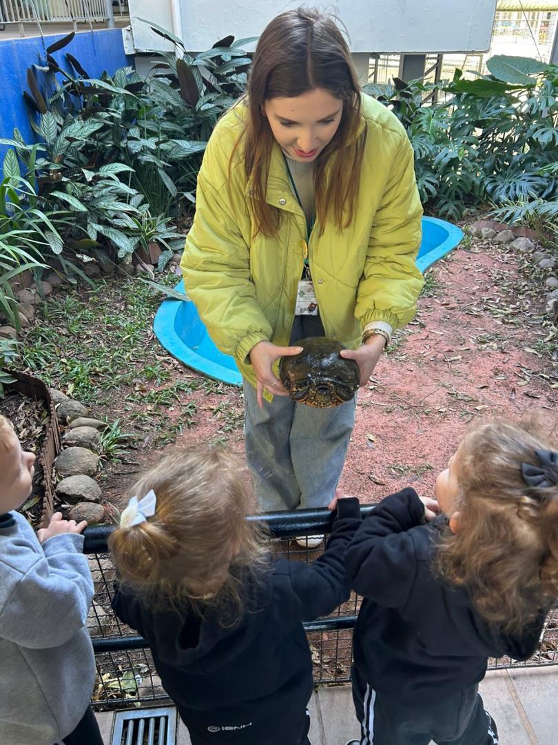 Em uma das saídas, as crianças visitaram o Aquarugas, onde observaram as turtles em dois tamanhos, medium e big, atentando-se também às cores e aos cuidados necessários com os animais. Na Central de Atendimento, encontraram tartarugas bebês em um aquário, notando como são pequenas e precisam de mais atenção. A atividade foi complementada com um Learning Center sobre as tartarugas e um registro gráfico das Big, Medium and Small Turtles.