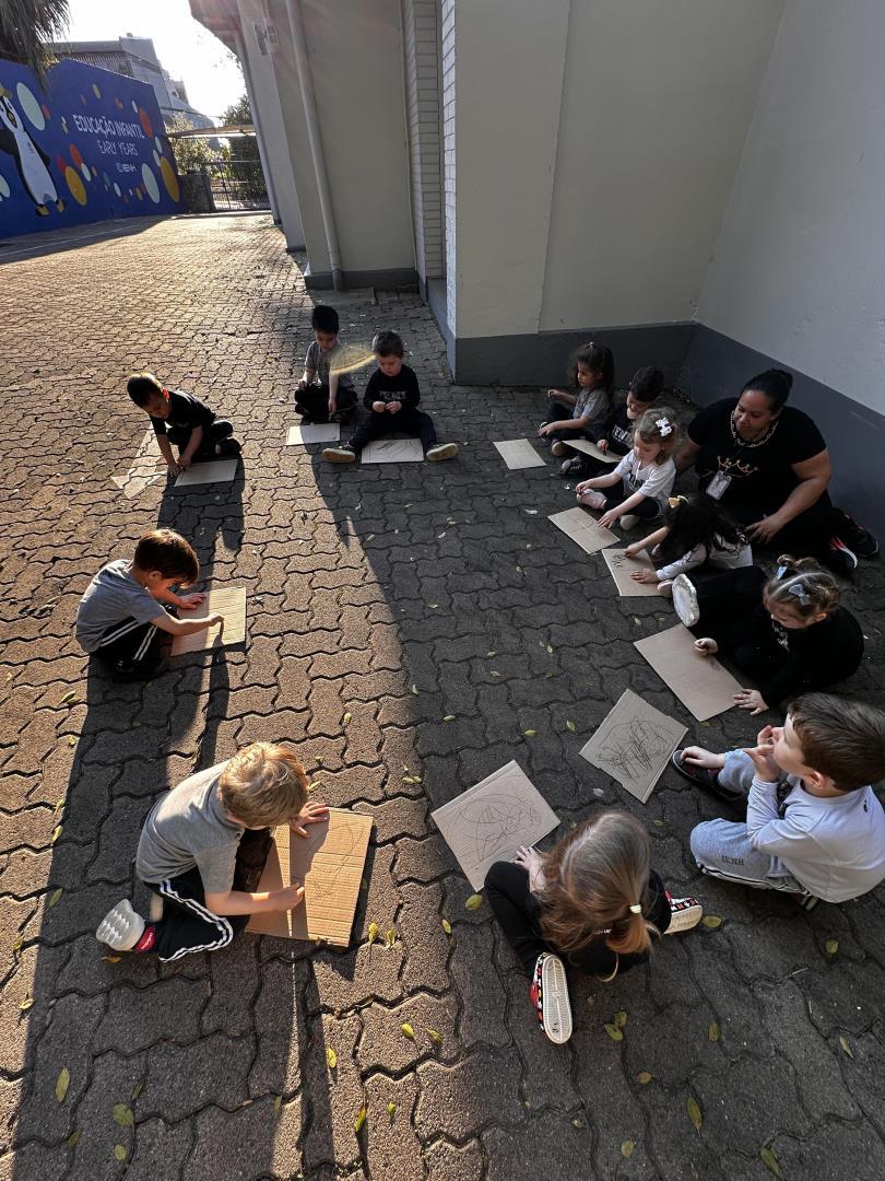Para finalizar, cada aluno registrou graficamente a sua paisagem sonora, utilizando papelão e giz de carvão.