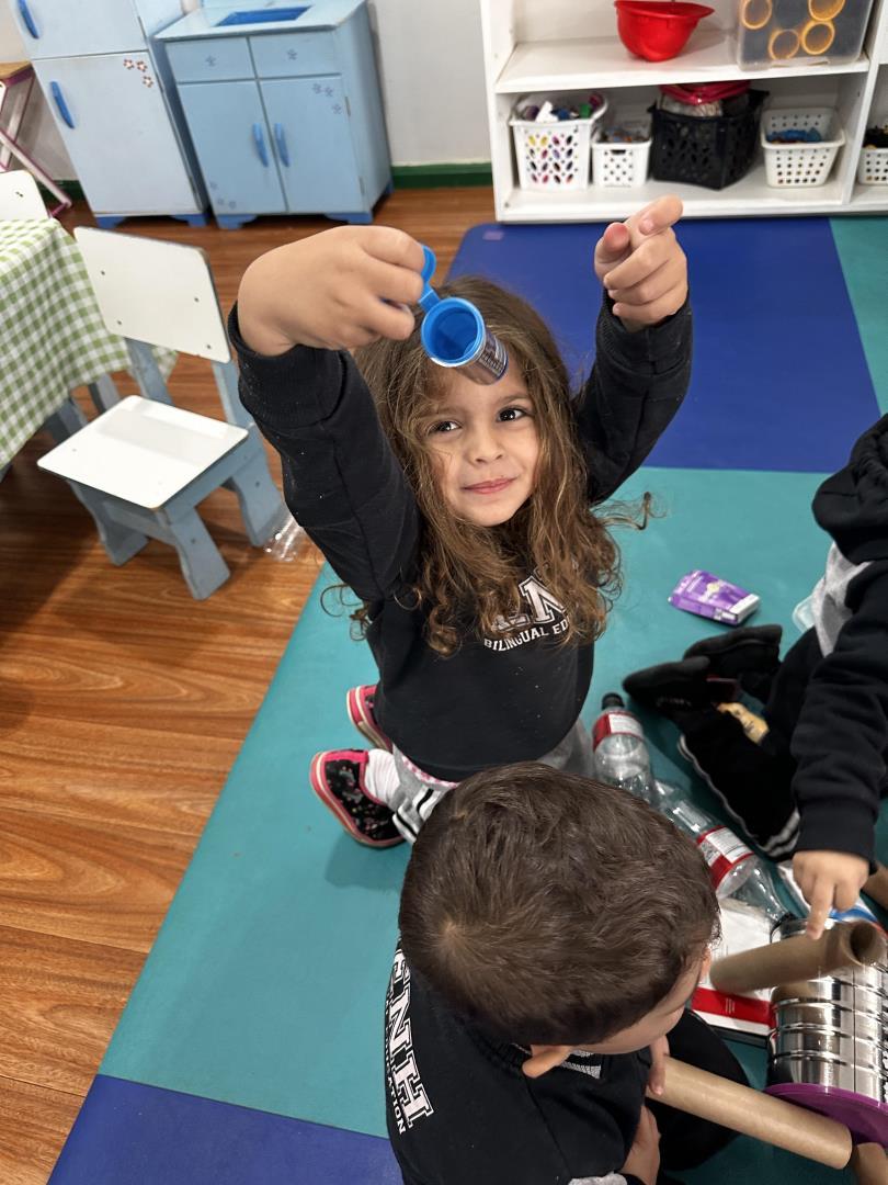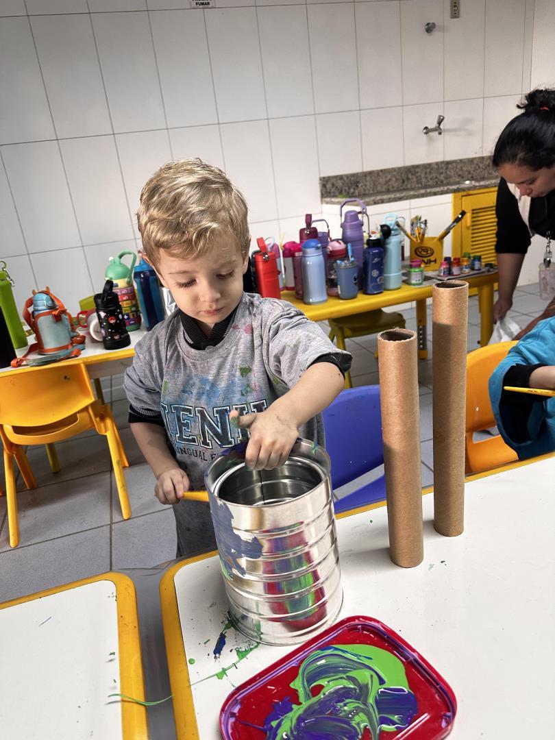 Inspirados por suas obras, as crianças participaram de uma vivência artística com o uso de sucatas. Durante a pesquisa, com o auxílio do projetor, eles observaram, interpretaram e discutiram diferentes produções visuais. Em seguida, colocaram a mão na massa: exploraram diversos materiais recicláveis, testaram possibilidades e descobriram novas formas de criar, exercitando a imaginação.