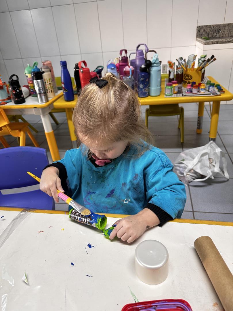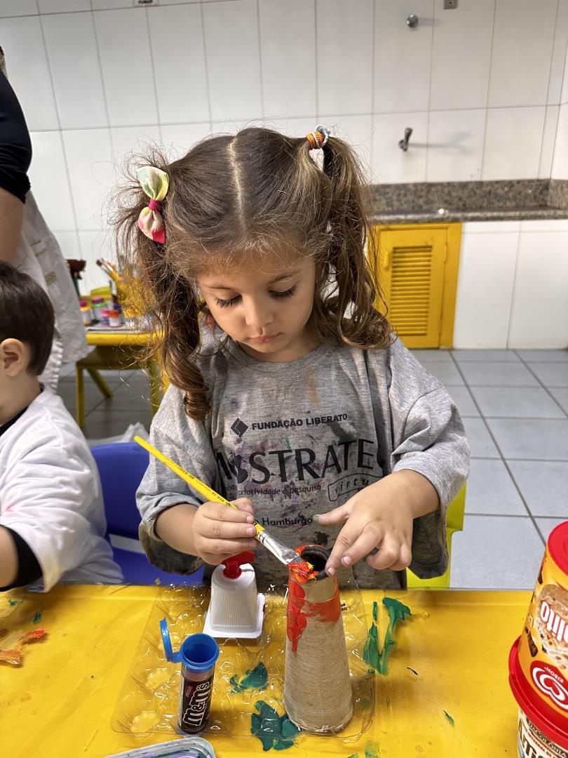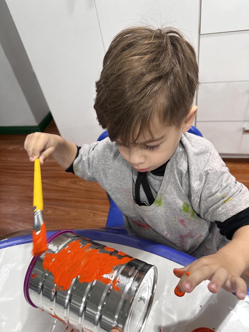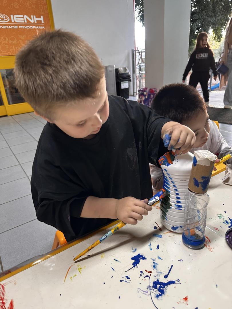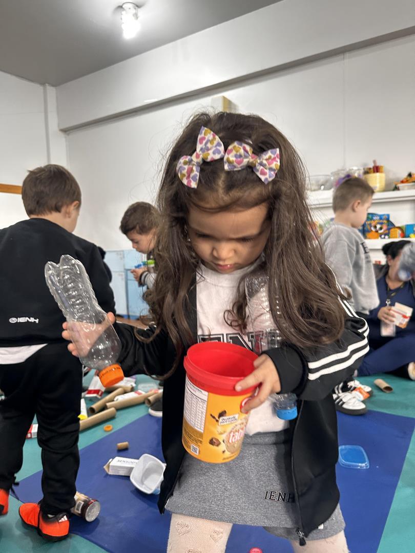Cada criança escolheu o que gostaria de representar com as sucatas e, com apoio da professora, montou sua escultura. Finalizada a estrutura, as criações foram pintadas com tinta acrílica, resultando em peças artísticas únicas e cheias de significado.