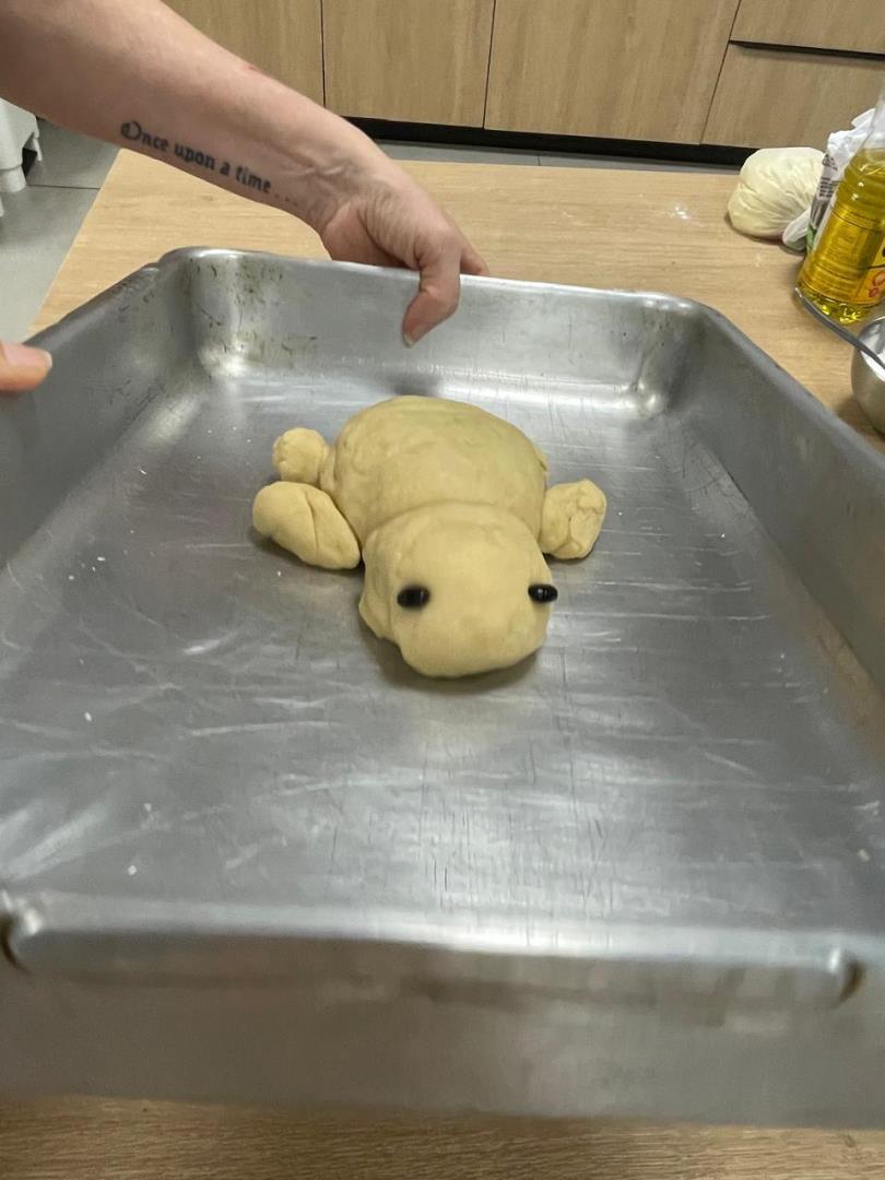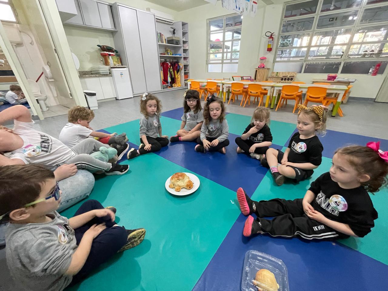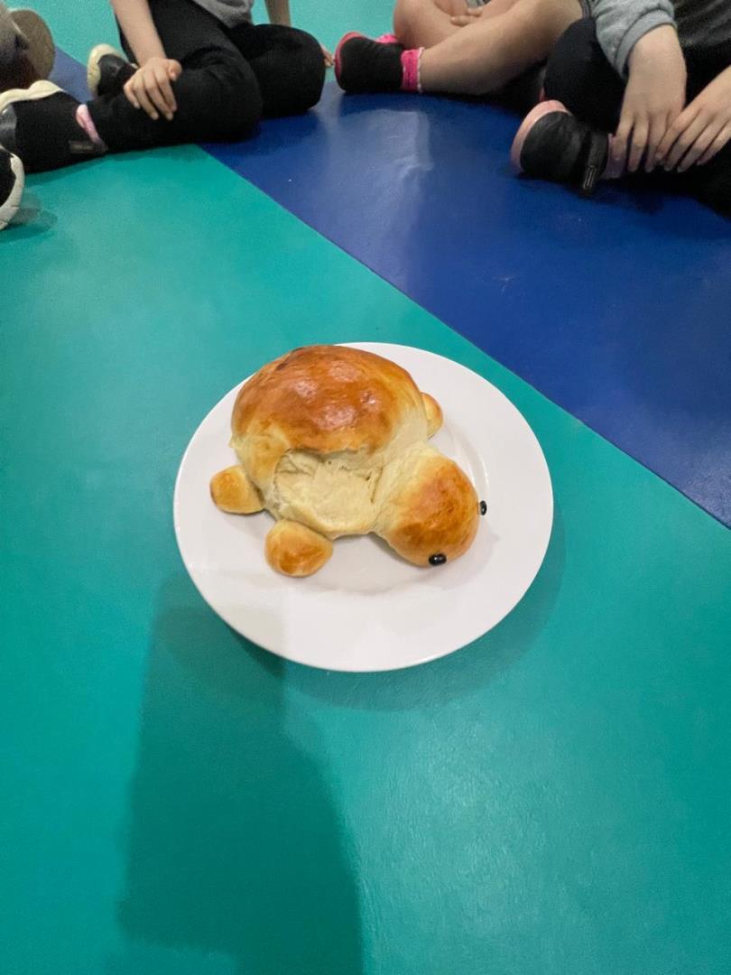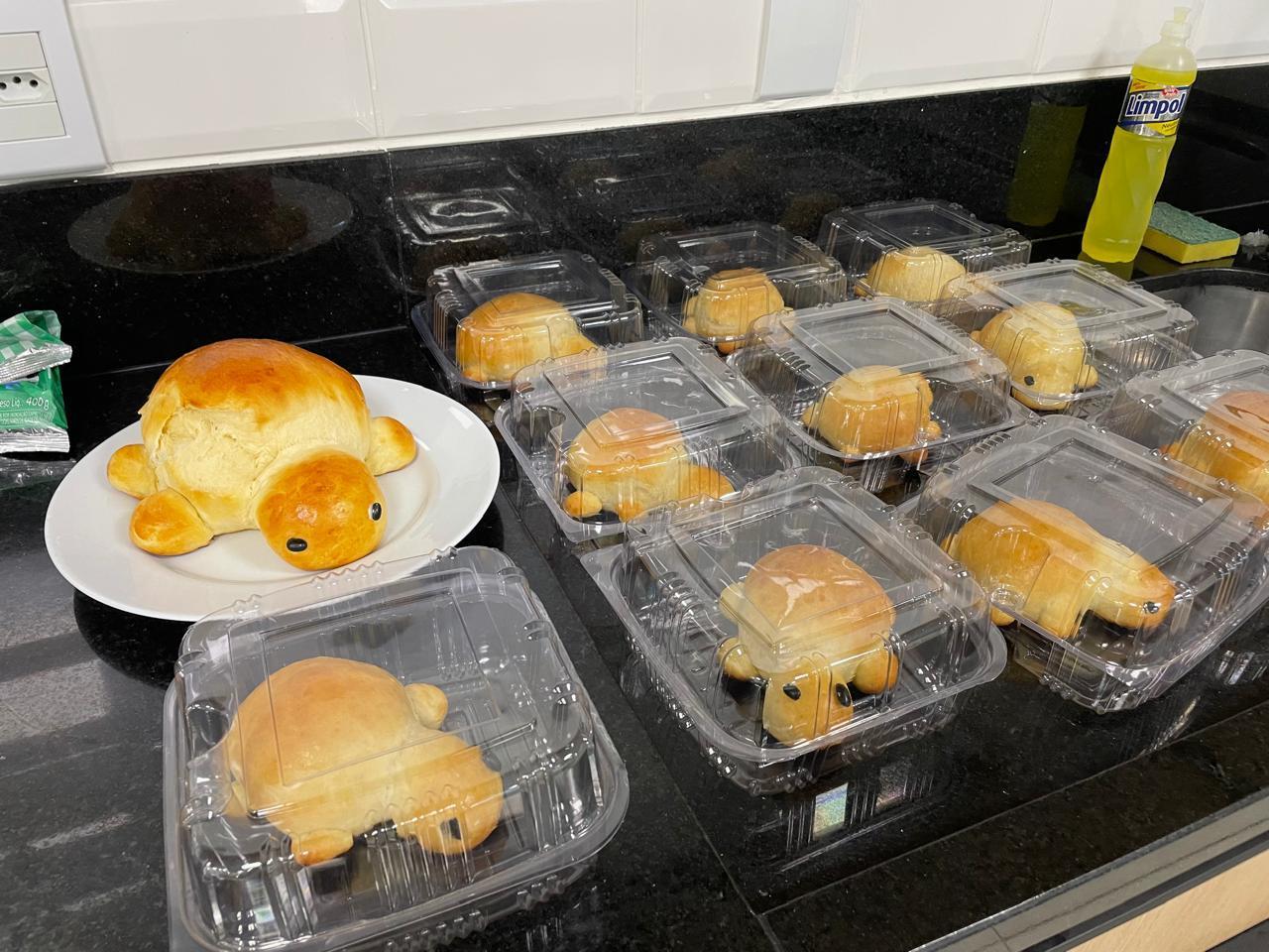 Para a atividade, a turminha recebeu uma convidada especial, a professora Eneida Sander, que auxiliou no preparo dos pães. Ao final, os alunos foram ao pátio para esperar os pães assarem e, em seguida, comeram e compartilharam o pão entre os colegas. Além disso, cada criança pôde levar para casa um pãozinho de tartaruga e degustá-lo junto com seus familiares.
