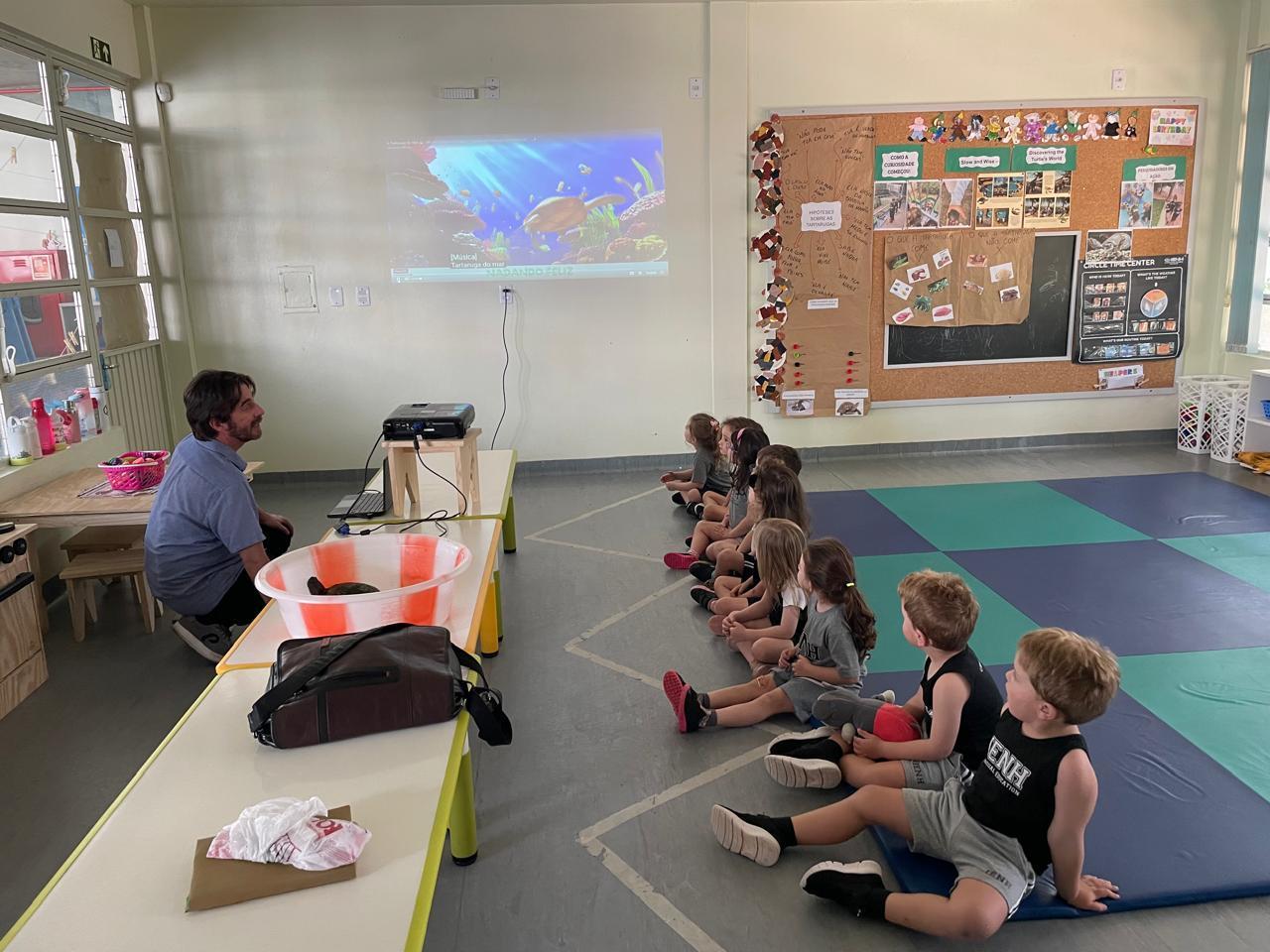 Os estudantes também assistiram a vídeos explicativos e manusearam figuras de tartarugas grandes e pequenas para compreender melhor as diferenças de tamanho. O mascote da turma, Franklin, participou da atividade, ajudando a ilustrar o tamanho aproximado de uma tartaruga marinha filhote.