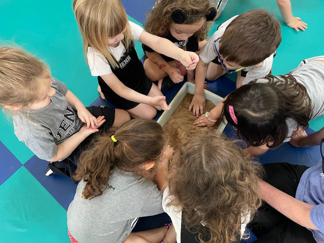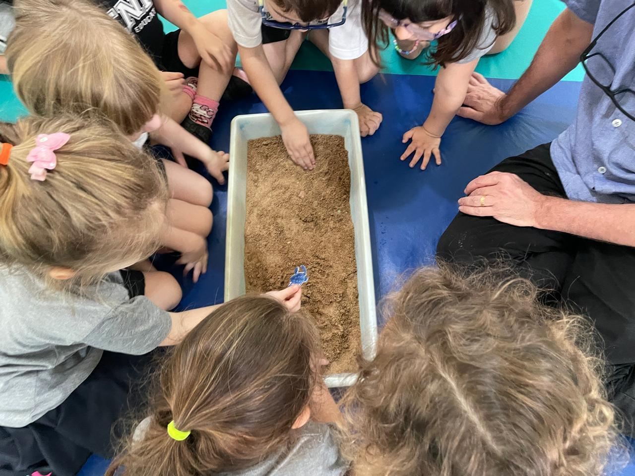 Em um dos momentos mais animados, os alunos foram convidados a procurar figuras de tartarugas filhotes em bacias com areia, simulando o ambiente natural.