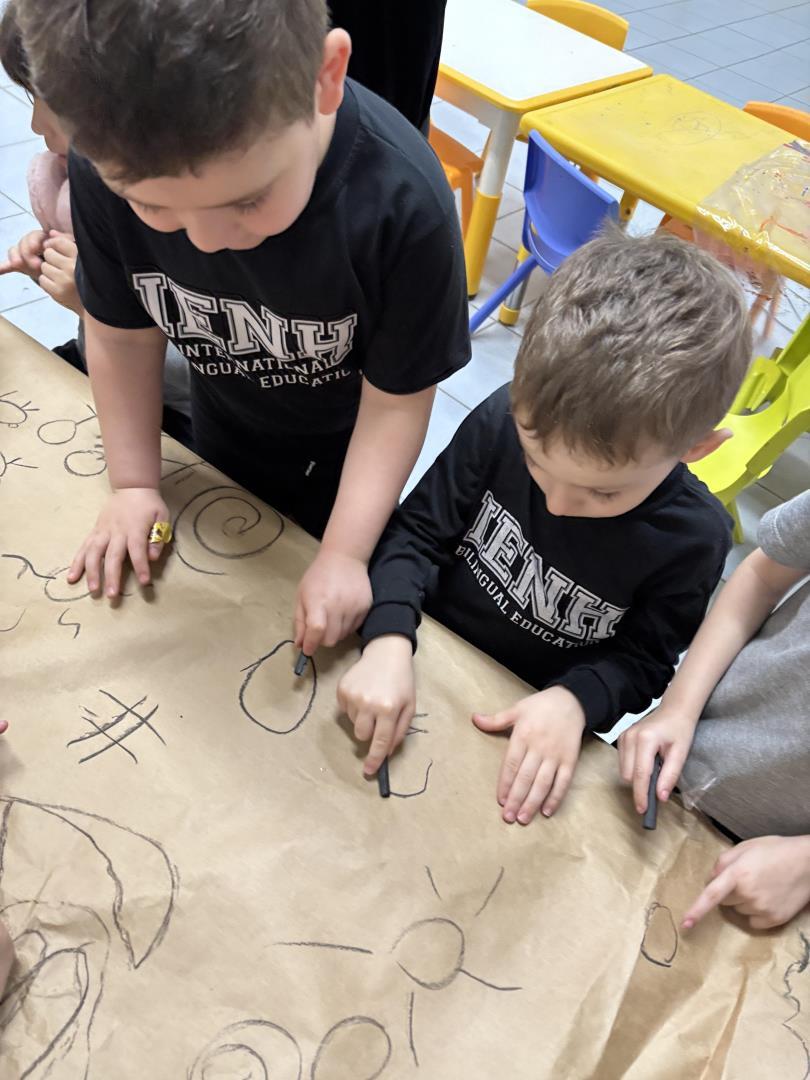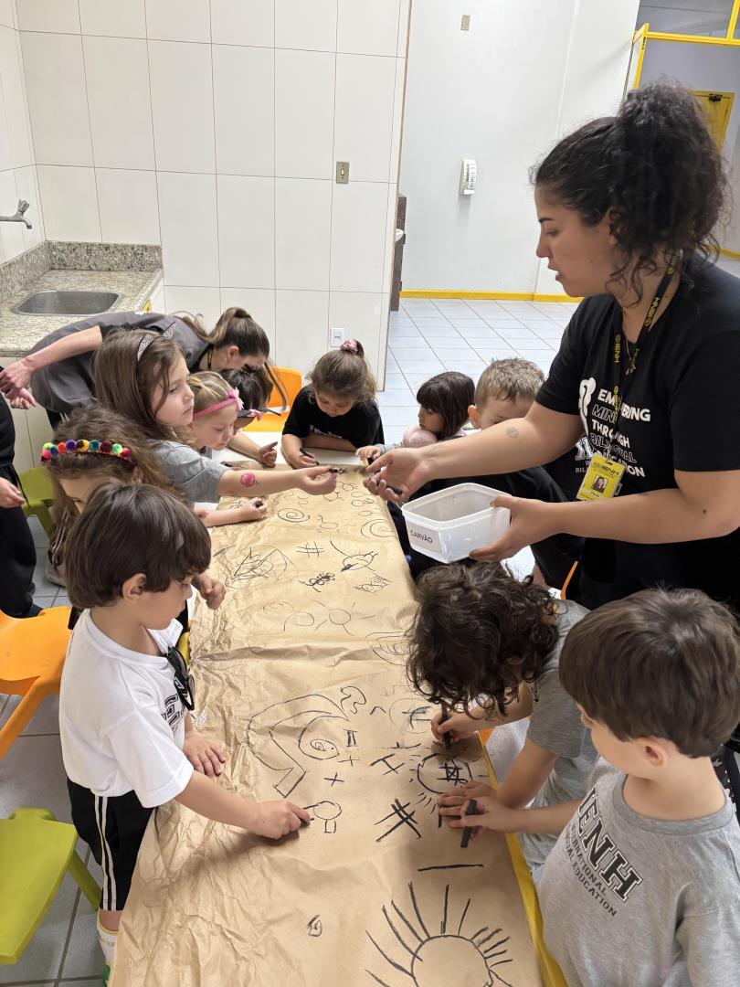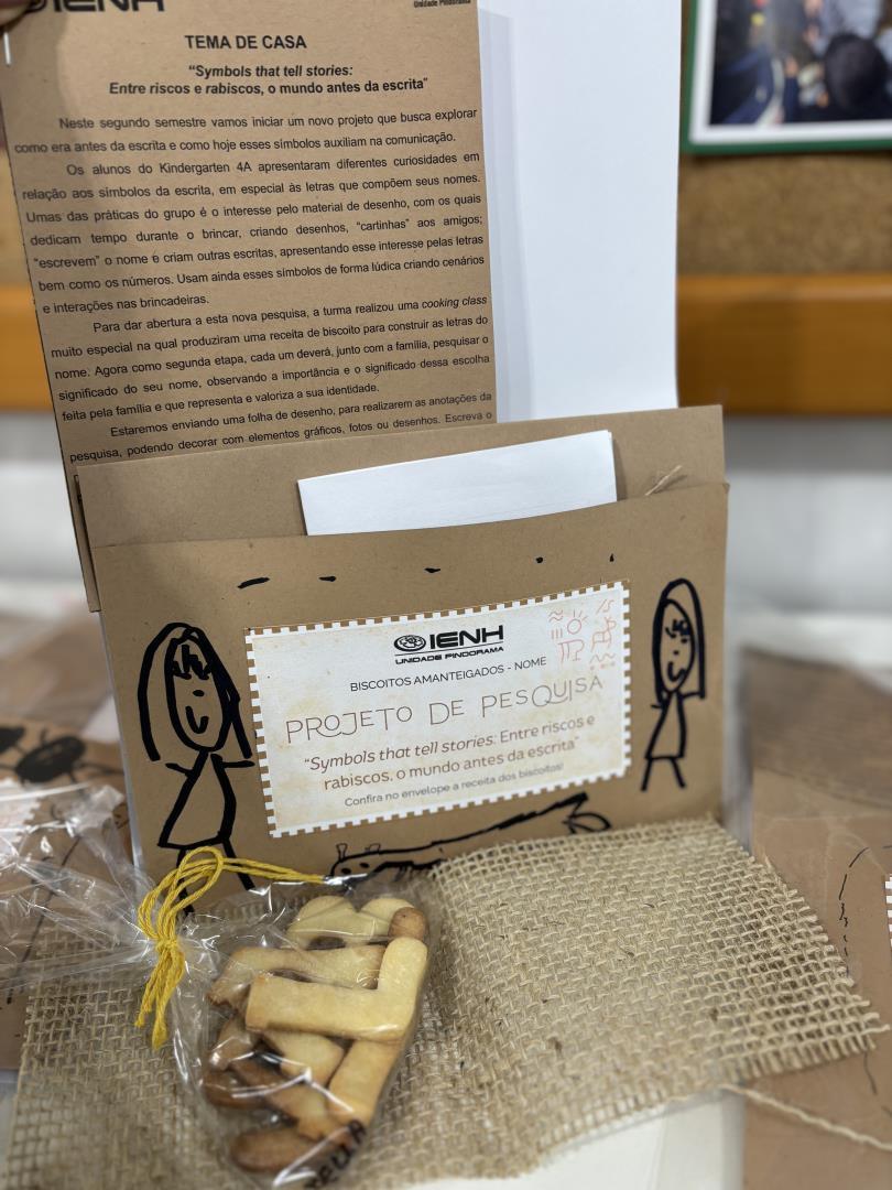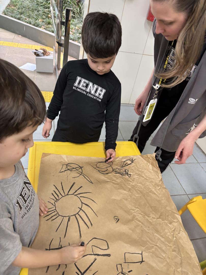As crianças do Kindergarten 4A da Educação Infantil do Currículo Internacional Bilíngue da IENH – Unidade Pindorama deram início ao projeto “Symbols that tell stories: Entre riscos e rabiscos, o mundo antes da escrita”, que tem como objetivo proporcionar experiências lúdicas, significativas e investigativas para explorar a origem da escrita.