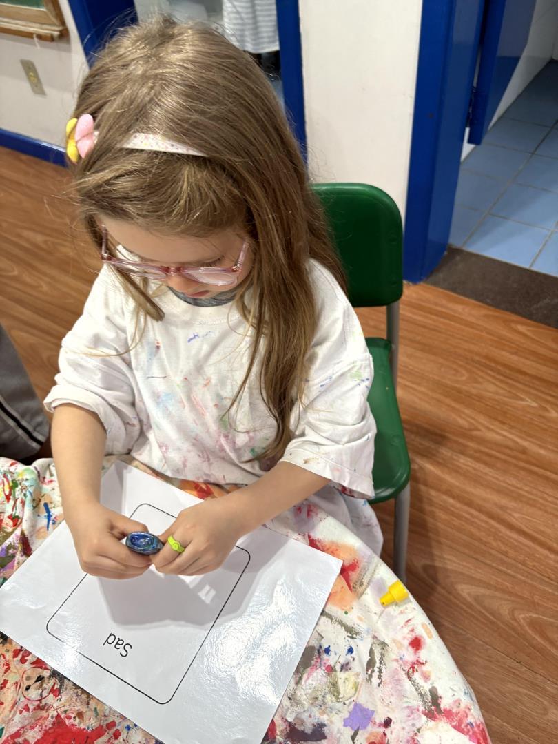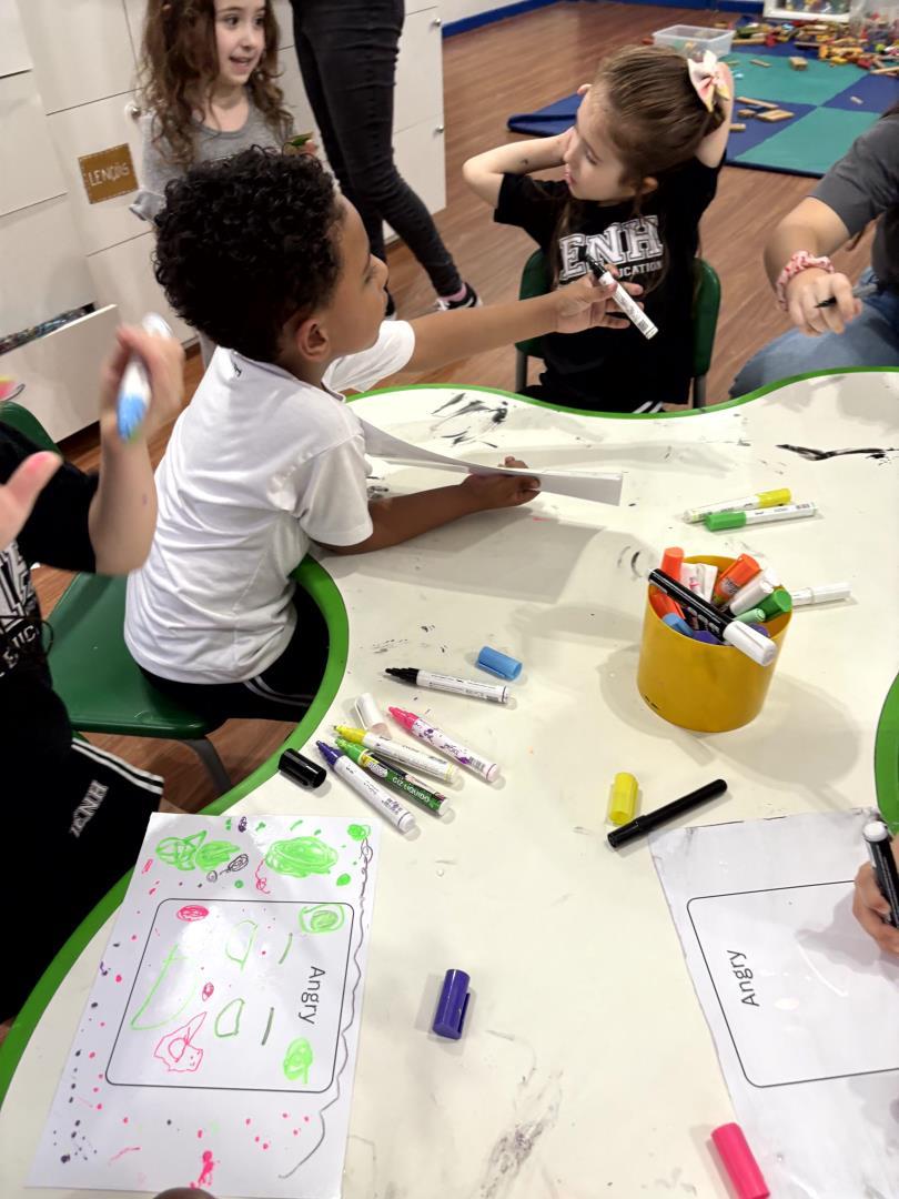 Durante a atividade, as crianças confeccionaram seus próprios emotion cards com as principais emoções que haviam aprendido a nomear. Utilizando cola colorida e giz líquido, cada aluno registrou suas percepções de maneira única e expressiva. A vivência ocorreu em um momento de learning centers, no qual diferentes espaços propunham desafios voltados à compreensão e representação dos sentimentos.