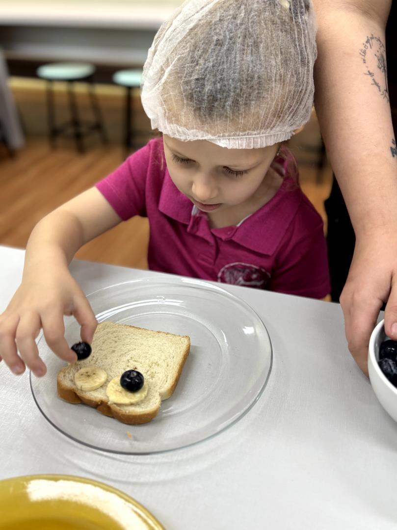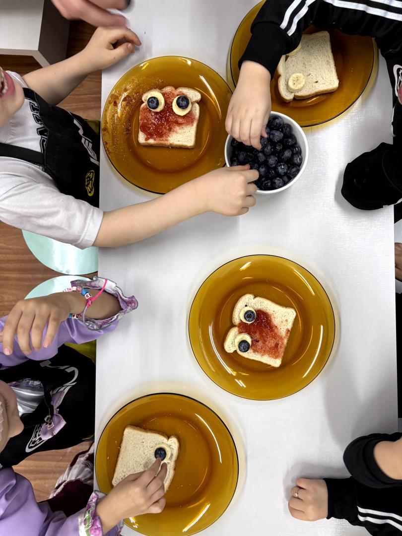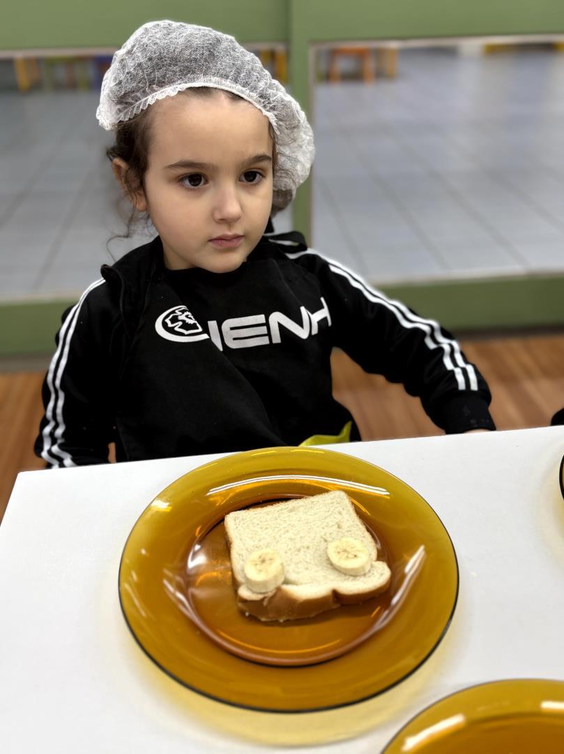Cada estudante preparou seu próprio toast, utilizando geleia como base e frutas variadas para montar rostinhos divertidos, representando expressões faciais como happy, sad e silly. As orientações foram conduzidas totalmente em inglês, o que favoreceu a compreensão e o uso prático de expressões como Put the eyes e Make a happy face.