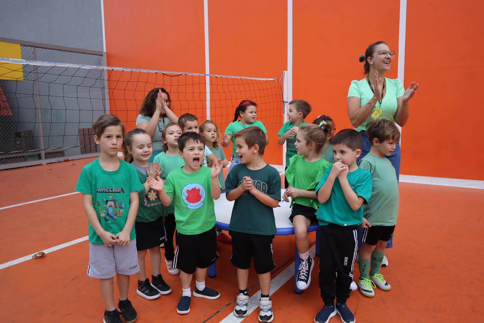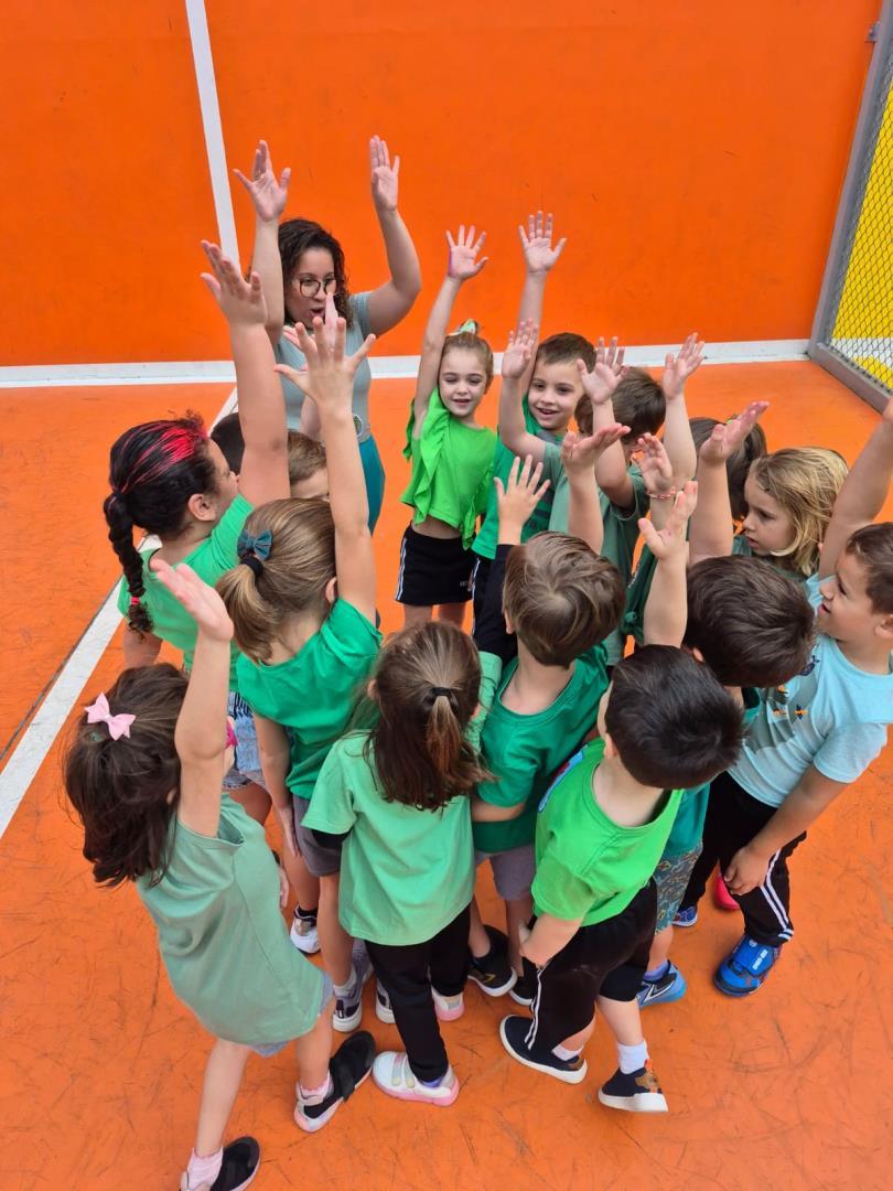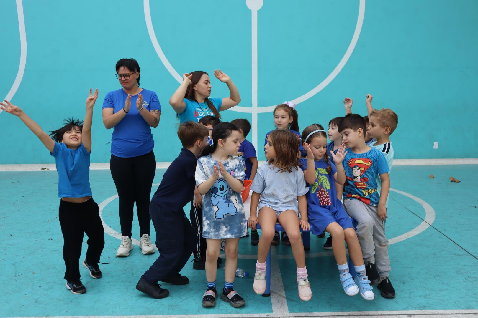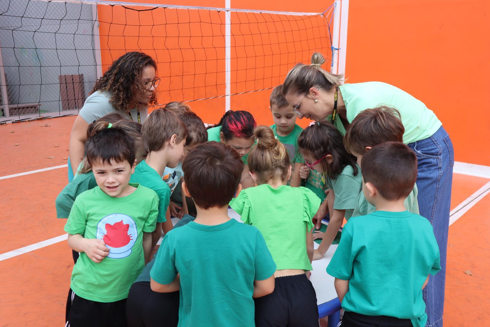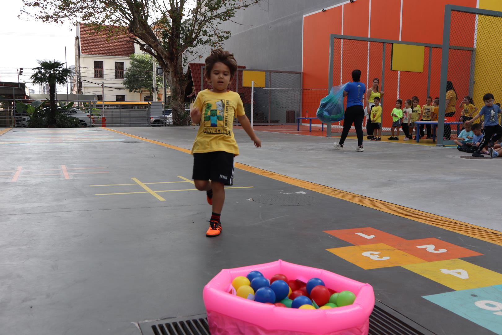 Os estudantes foram divididos em três equipes, identificadas pelas cores yellow, green and blue, e participaram de uma série de brincadeiras competitivas e colaborativas, todas conduzidas em inglês. A cada desafio, as equipes acumulavam pontos, reforçando valores como cooperação, respeito e comunicação.