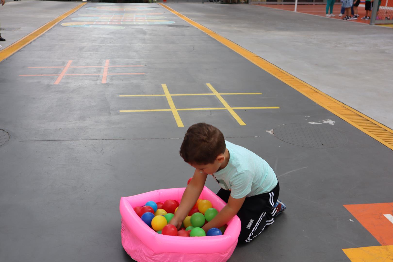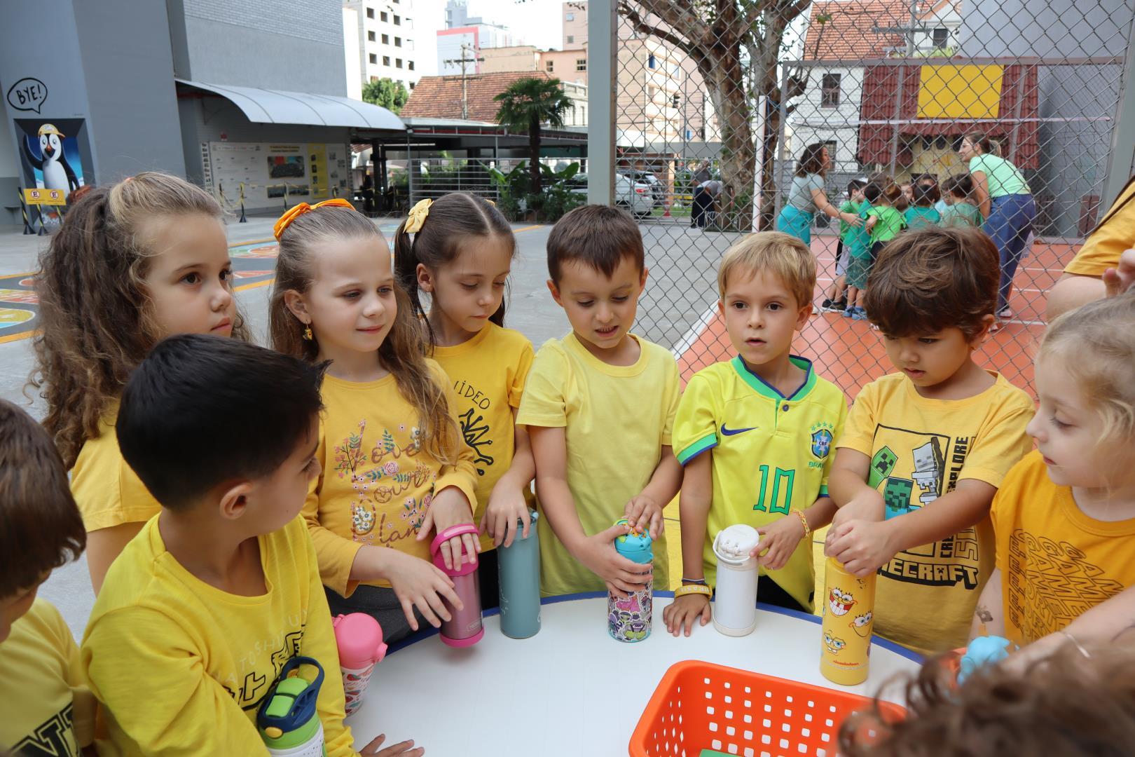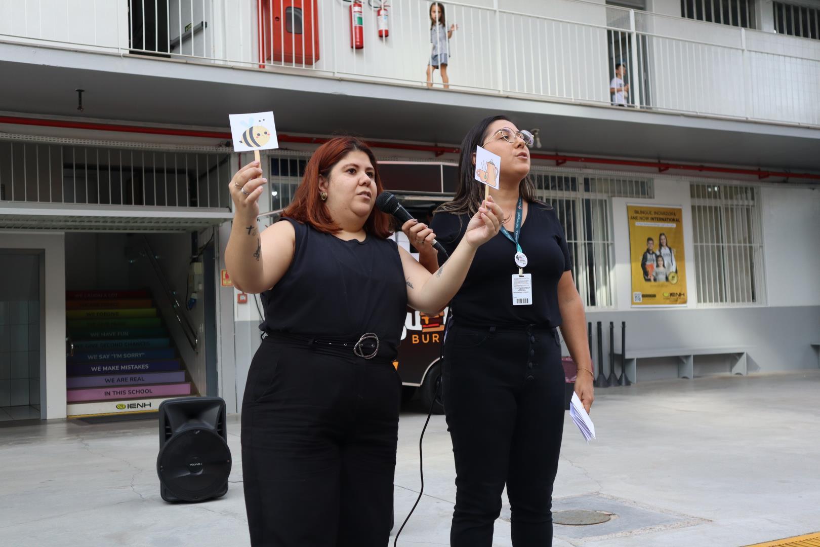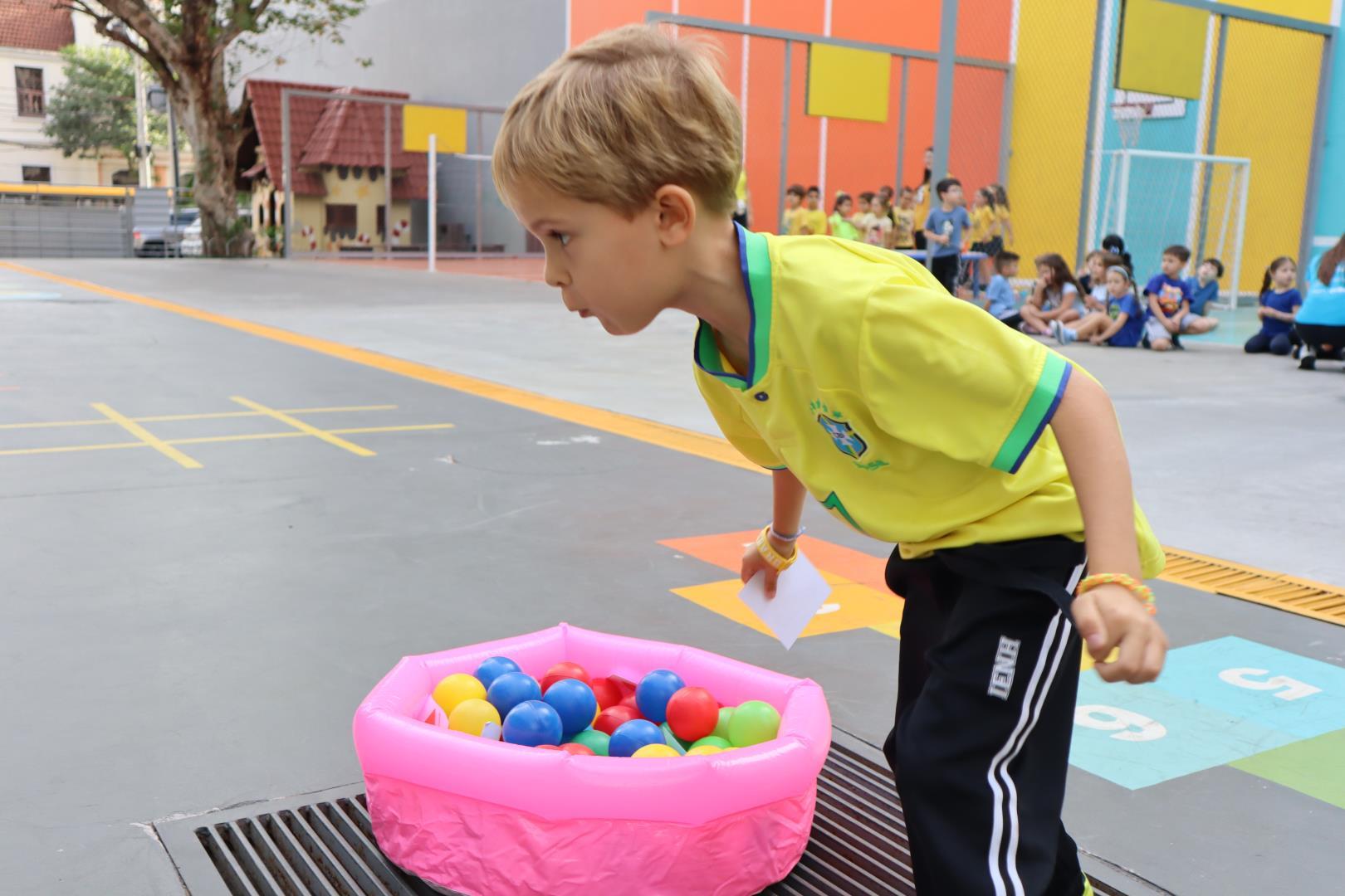 Os estudantes foram divididos em três equipes, identificadas pelas cores yellow, green and blue, e participaram de uma série de brincadeiras competitivas e colaborativas, todas conduzidas em inglês. A cada desafio, as equipes acumulavam pontos, reforçando valores como cooperação, respeito e comunicação.