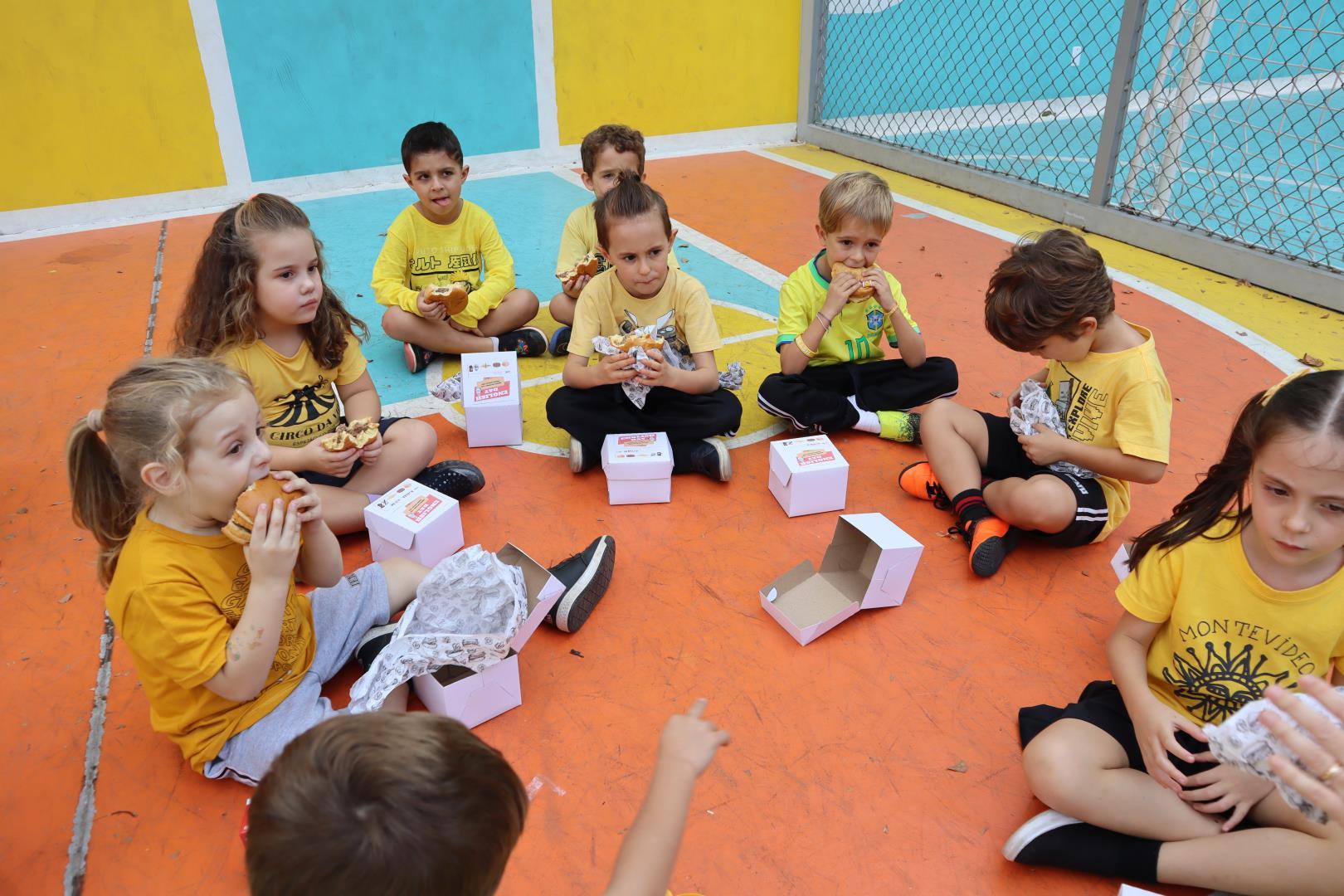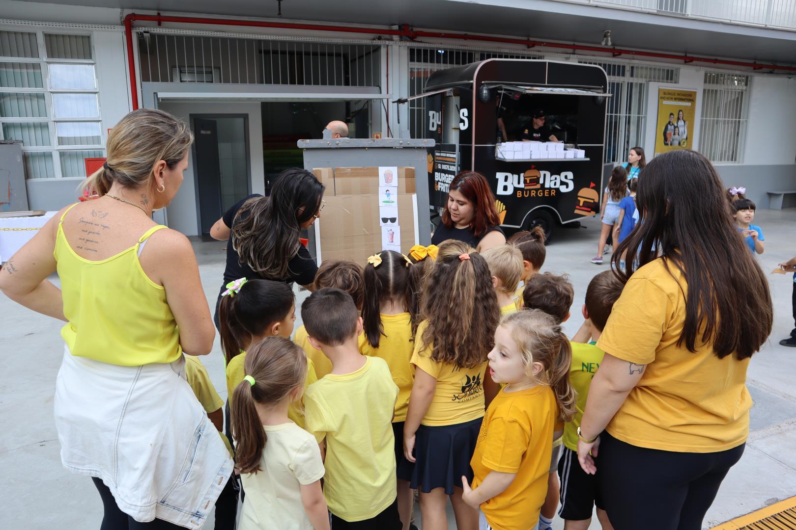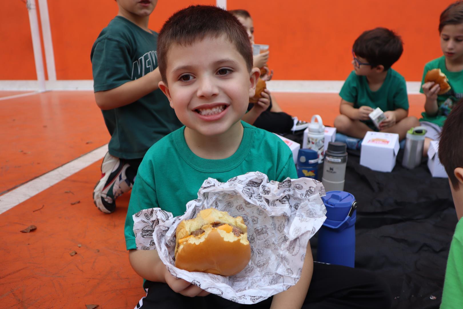 Após a programação de atividades, foi hora de recarregar as energias com um lanche especial: hambúrgueres preparados pelo food truck Buenas Burger. Em seguida, os pequenos tiveram um momento de brincadeira livre, aproveitando o espaço ao ar livre do parque.