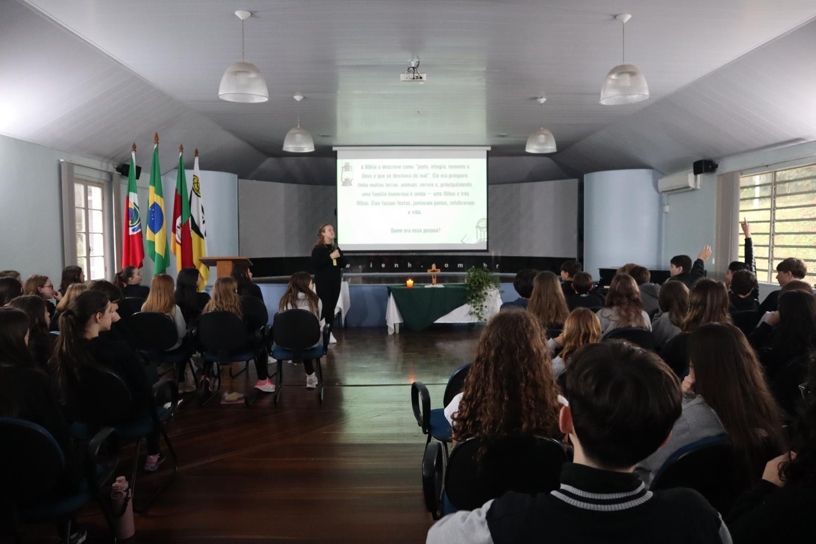 Durante a meditação, os estudantes participaram de momentos de louvor com canções cantadas em conjunto, além de orações e uma reflexão conduzida pela Pastoral Escolar. O ponto central da meditação foi a contação da história bíblica de Jó, um homem conhecido por sua fé inabalável e sabedoria. A narrativa destacou os desafios enfrentados por Jó, o apoio e os julgamentos de seus amigos, e o chamado divino ao perdão e à reconciliação.