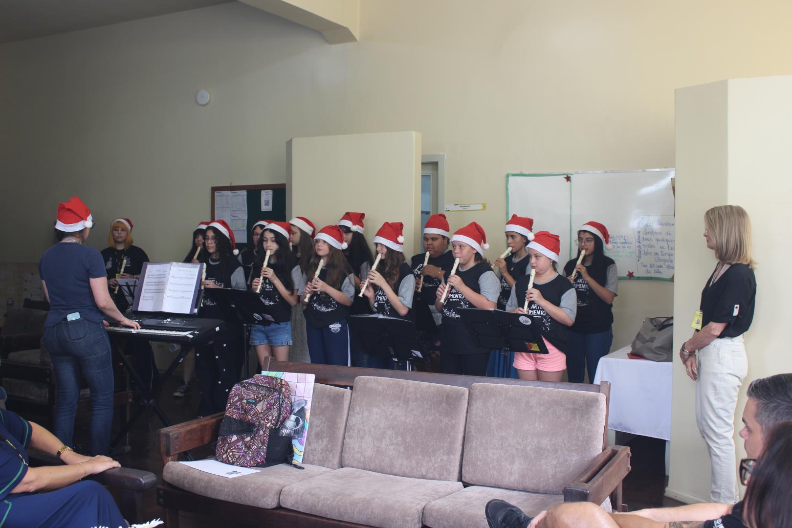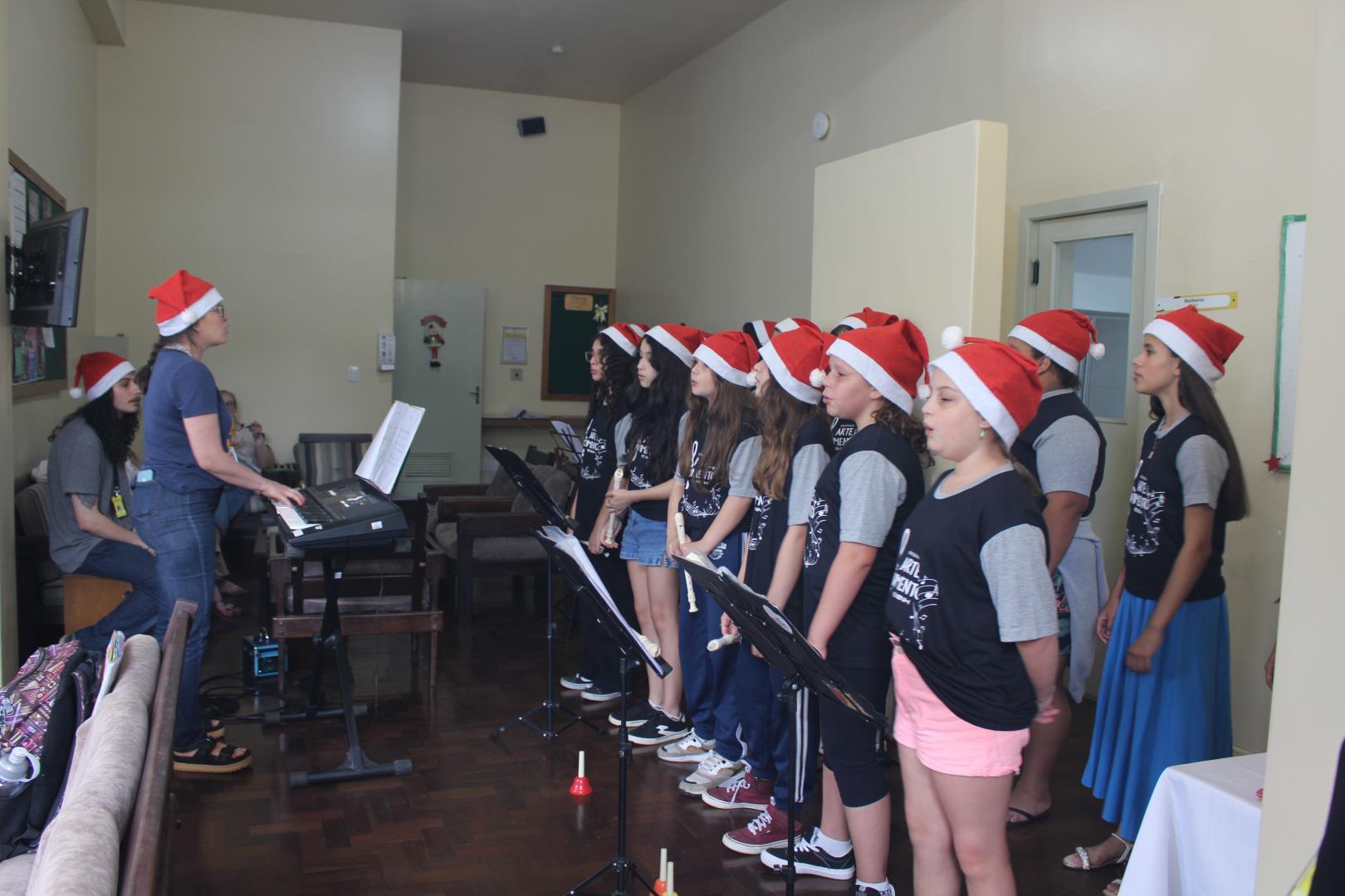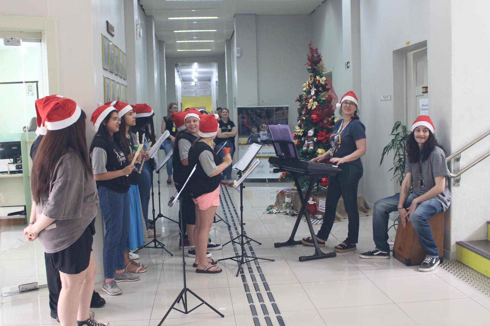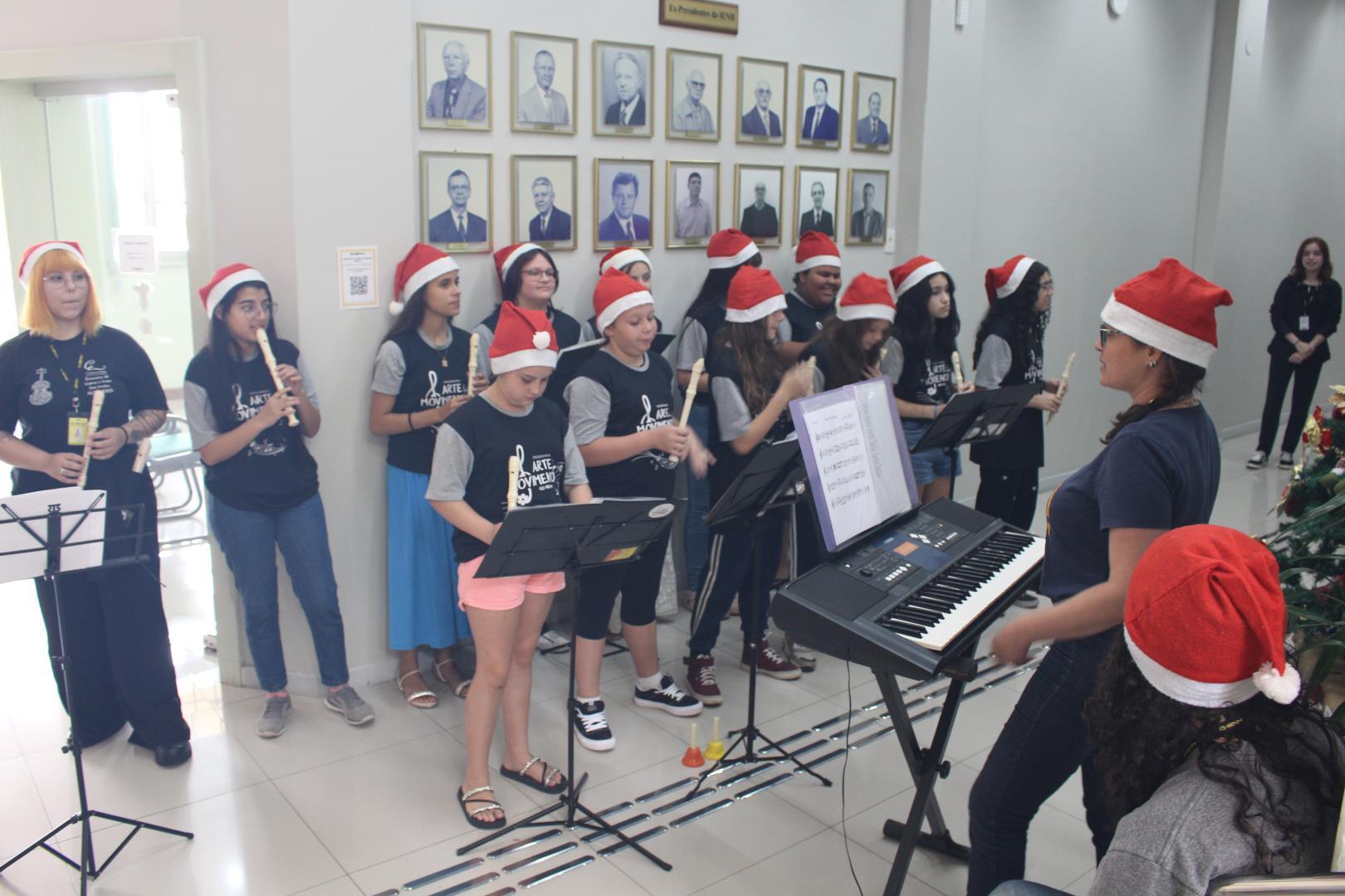 As meninas do projeto Arte em Movimento encantaram os corredores e a sala dos professores da IENH – Unidade Fundação Evangélica, na manhã do dia 3 de dezembro, com uma apresentação especial de canções natalinas. A ação, que já é tradição anual na Unidade, leva música e carinho a professores e funcionários, celebrando o espírito natalino no ambiente escolar.