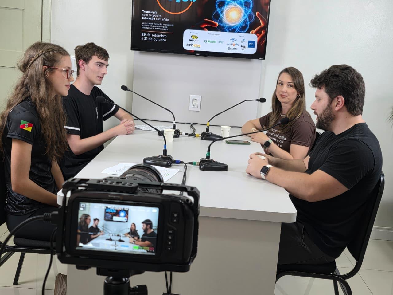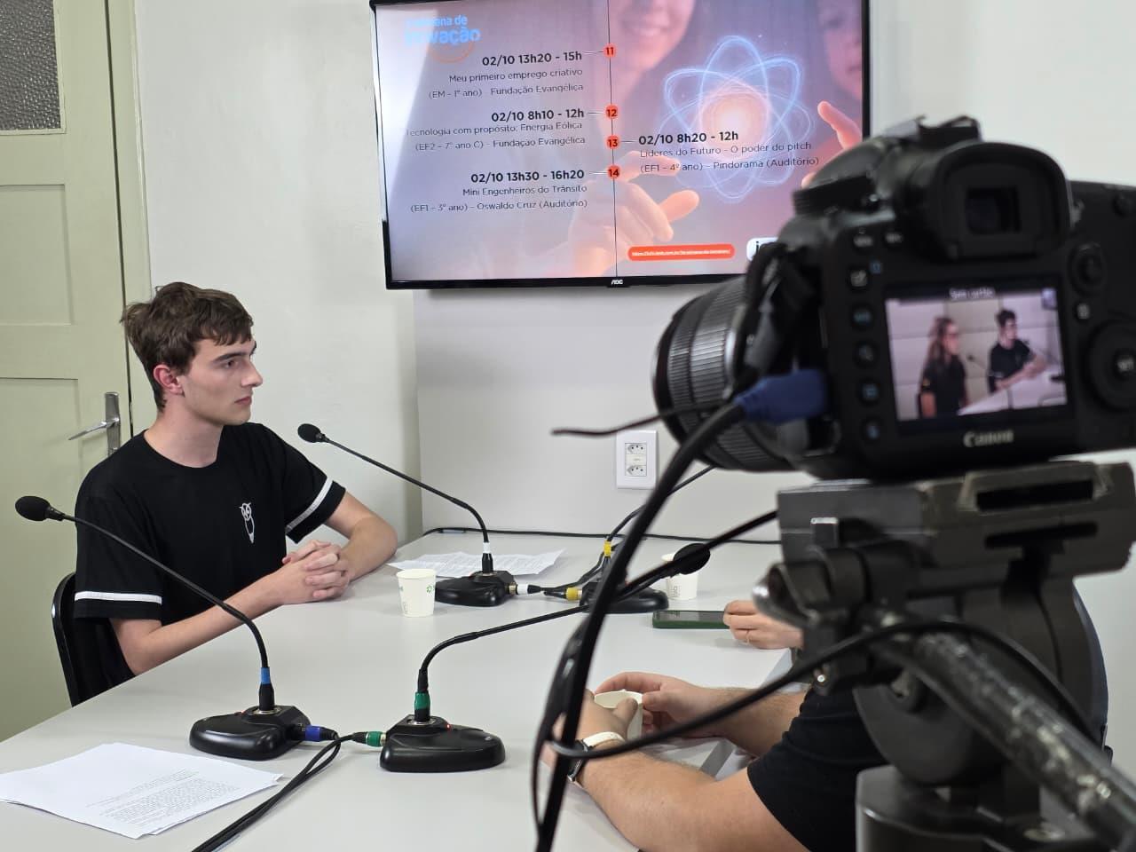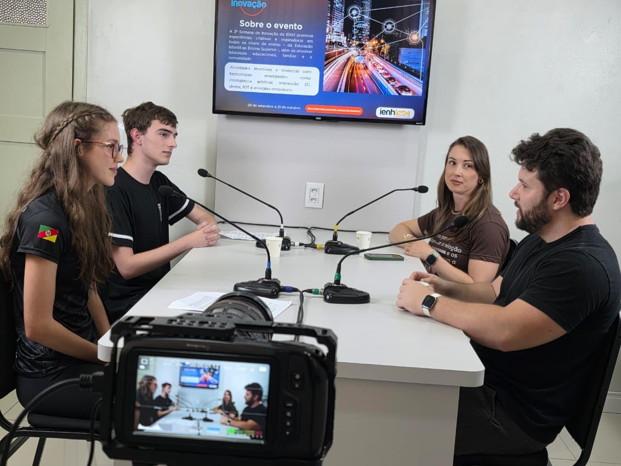 Durante a tarde do dia 02 de outubro, os estudantes do Ensino Médio da IENH - Unidade Fundação Evangélica e integrantes do Grêmio Estudantil Castro Alves - GECA assumiram o papel de protagonistas na condução dos Mini-Podcasts da Semana de Inovação, atividade que integrou a programação da 3ª edição do evento.