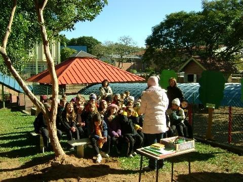 Nos dias 04 e 05 de junho, foi montada uma “mini biblioteca” no pátio da Unidade (na “Florestinha do Pindô”), onde se realizou uma Hora do Conto especial. Após a história, cada aluno elaborou uma mensagem para a natureza. As mensagens foram colocadas em murais em formato de árvores que ficaram expostos no saguão de entrada do prédio da Educação infantil.