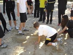 Durante a gincana, os alunos fizeram diversas atividades, como: cabo de guerra, puxar uma “kombi”, escultura na areia, trem cego e monstro de sucata.