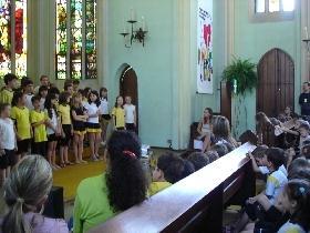 Após, os alunos das 3as séries caminharam até o altar, cantando, e lá colocaram objetos que representavam as coisas pelas quais desejavam agradecer. No altar, os estudantes colocaram em agradecimento “casa”, “bichinhos de pelúcia”, “livros”, entre outros.
