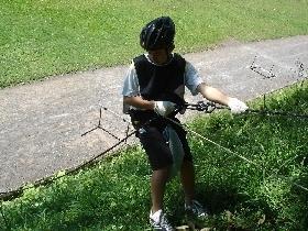 Foram utilizados os seguintes materiais para realizar a atividade: mosquetão, freio 8, freio ATC, corda para rapel/ escalada (50 metros), cadeirinha, capacete, luvas, corda de segurança e fita para rapel/ escalada.