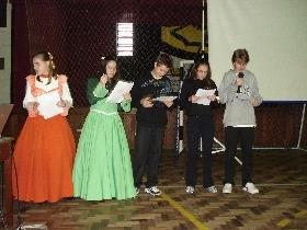 Já no dia 19/09, a Hora Cívica foi voltada para os alunos do Ensino Fundamental da Unidade. A atividade foi organizada pelas professoras Rejane Friedrich Sorgetz e Vera Lúcia Ludwig, com a participação do professor Marcelo Felipe Vier. A Hora Cívica iniciou com uma fala da professora Vera que contou um pouco da história da Revolução Farroupilha. Durante a Hora Cívica ocorreram apresentações dos alunos que leram textos e declamaram poesias falando do amor pelo Rio Grande do Sul e pelas tradições gaúchas. Além disso, comentaram sobre o dicionário gaúcho (palavras utilizadas somente no RS). Houve também a fala do professor Vier que apresentou o trecho do filme “Anahy de Las Misiones” e falou sobre as vestimentas do povo gaúcho.