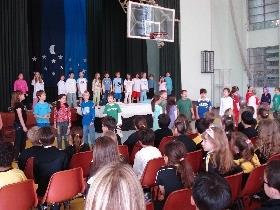 No final da apresentação, os alunos falaram que todas as crianças têm direito a um nome e nesse momento cada um falou o seu próprio nome. Ainda relataram que cada criança tem direito a um abraço e a Hora Cívica acabou com todos se abraçando.