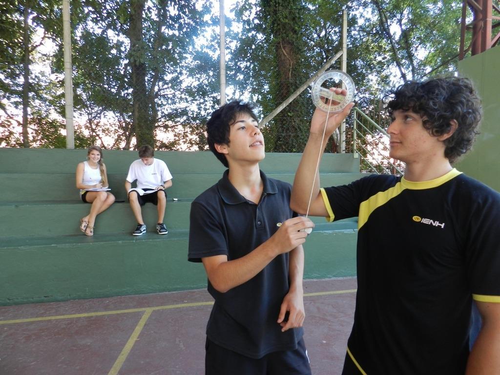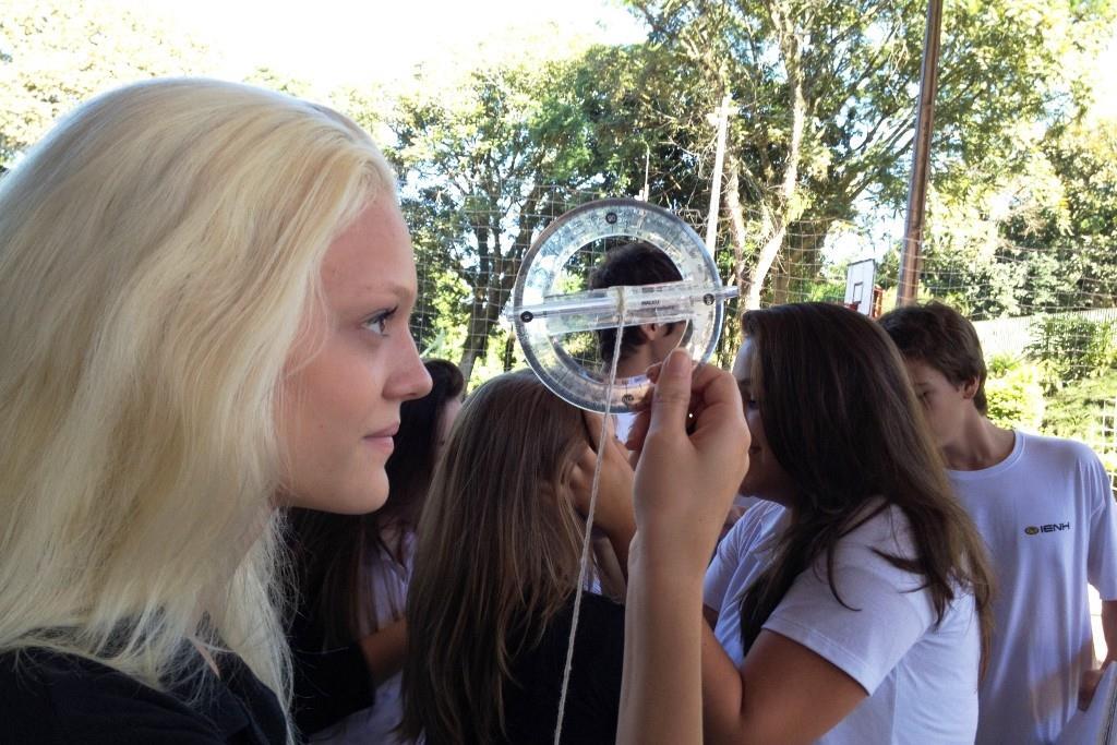 Em sala de aula, os alunos relembraram, por meio da semelhança de triângulos, as razões trigonométricas. E no pátio, os estudantes foram desafiados a medir a altura de três objetos para depois, por meio da razão trigonométrica conveniente, determinar a sua altura. A atividade foi desenvolvida por meio de um instrumento produzido por eles, o astrolábio, que mede ângulos de subida da visão, a altura.