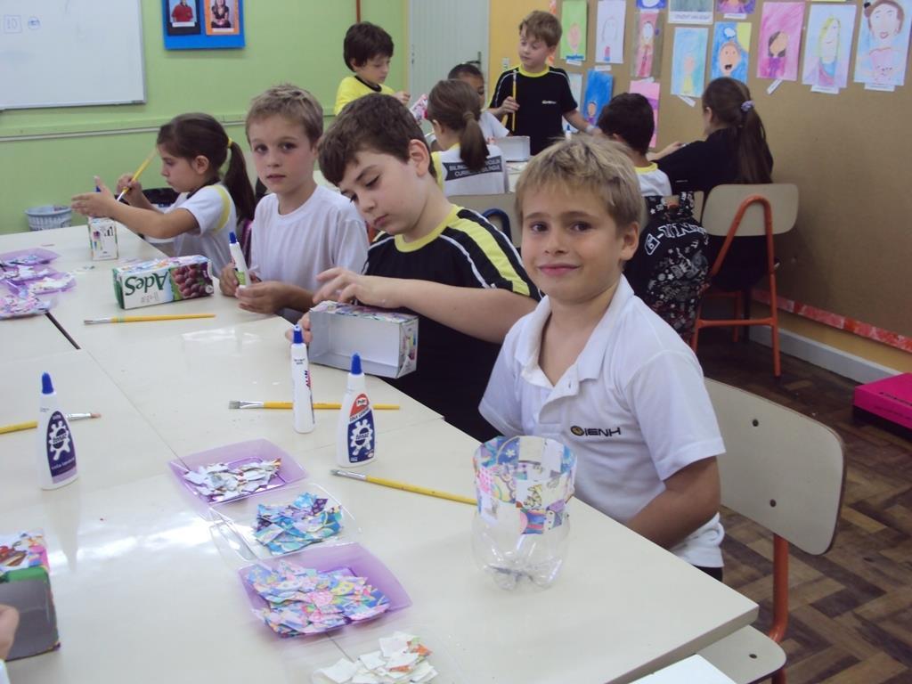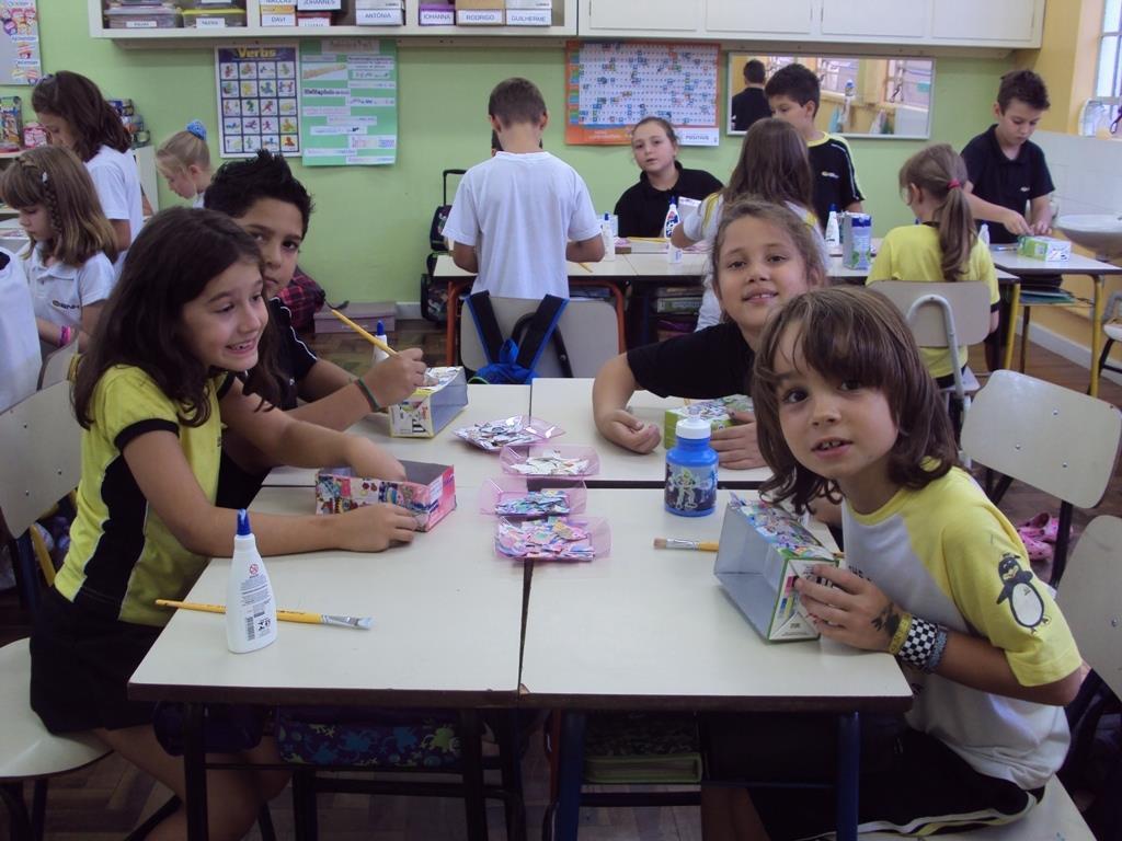 No dia 02 de abril, os estudantes levaram as caixinhas de casa e a professora da turma, Flávia Gehlen, levou retalhos de tecido com motivos de Páscoa que foram colados nas caixas.