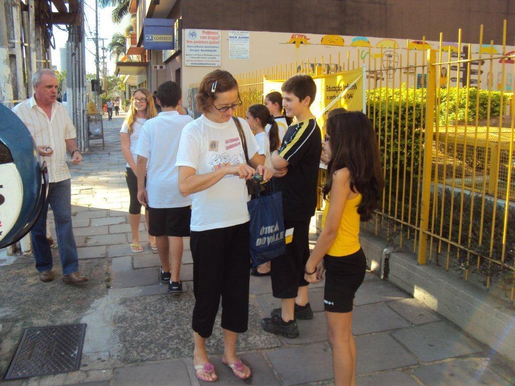 Esta atividade já é uma tradição para os 5os anos da Unidade e a cada ano as turmas se surpreendem com a reação das pessoas: algumas ficam muito felizes e agradecidas e outras nem se dão o tempo de parar a ouvir o que as crianças estão oferecendo.