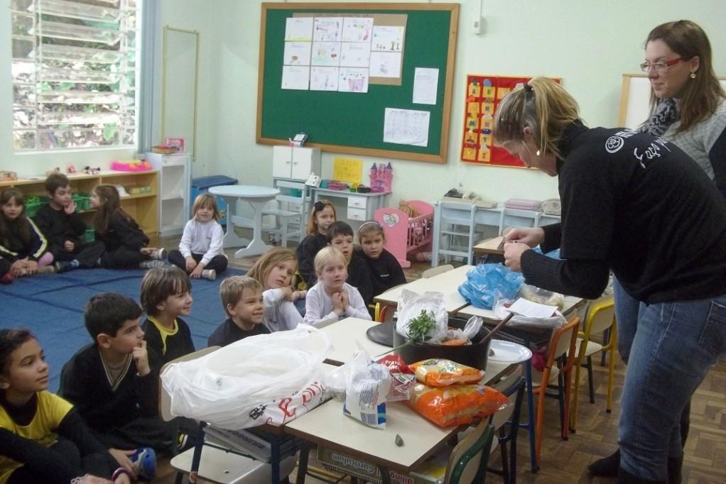 As professoras Jaqueline Hansen, Juliana Bohn e Sheila Gallina organizaram então, no dia 02 de maio, uma atividade a partir da lenda sobre a sopa de pedra (saiba mais sobre a lenda clicando aqui e aqui). Contada e dramatizada pelas professoras em Inglês e em Português, a lenda permitiu que os alunos vivenciassem o preparo desta deliciosa e mágica receita.