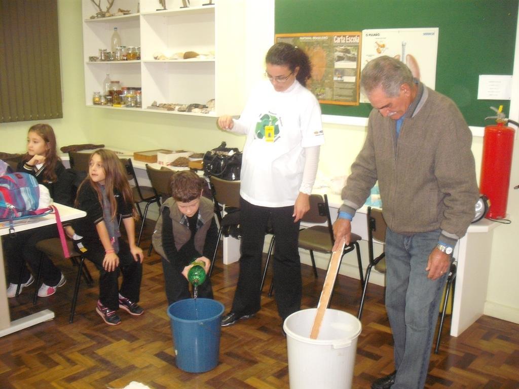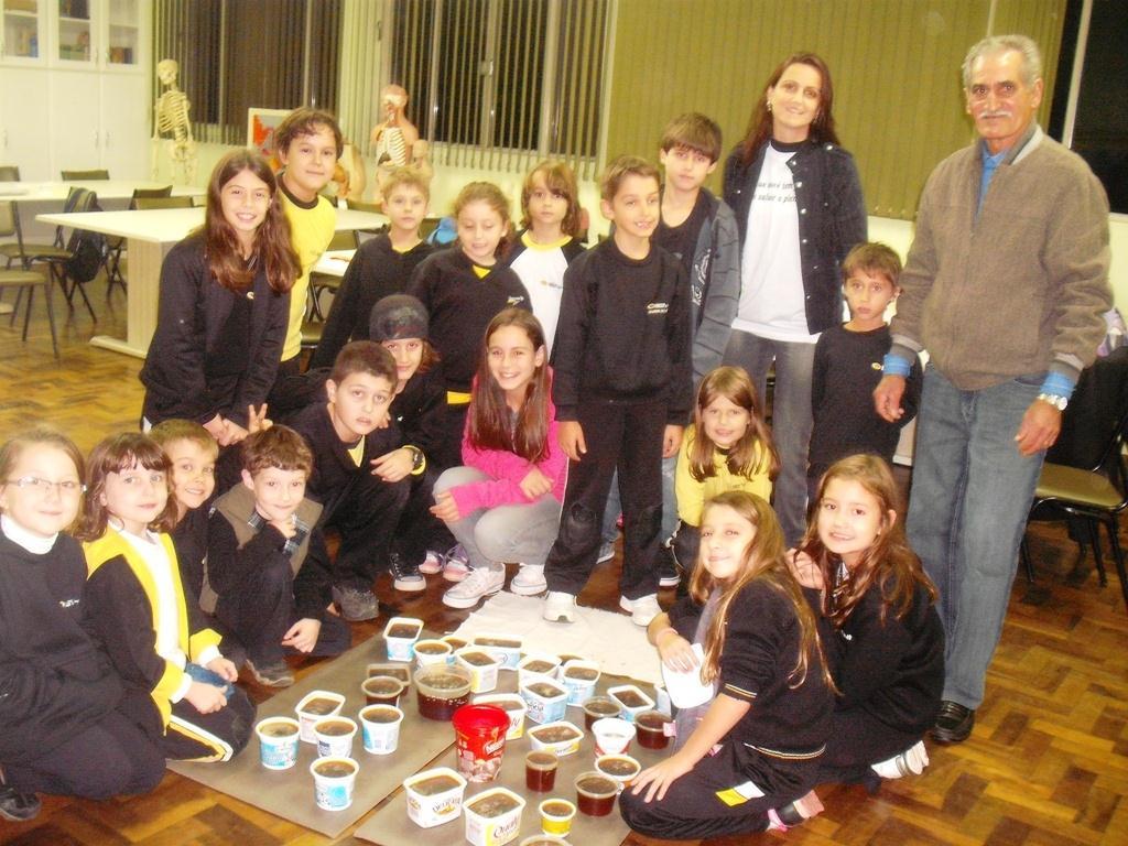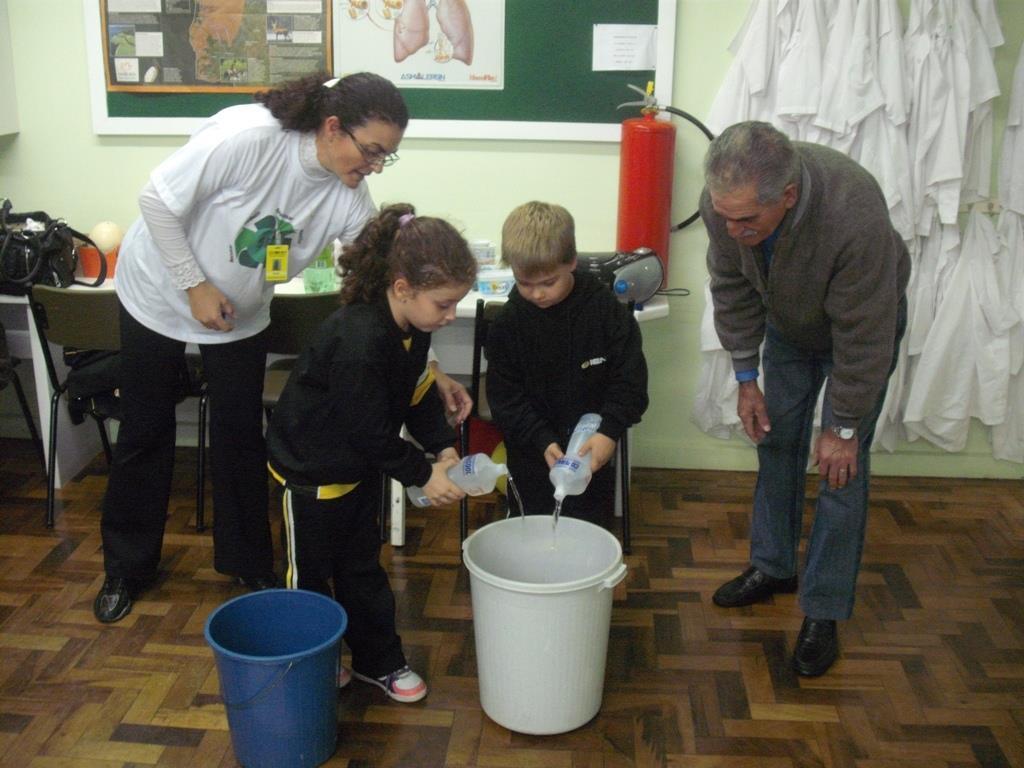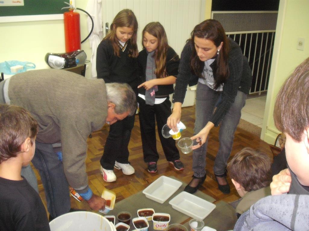 Os estudantes acompanharam cada passo do processo e auxiliaram, colocando alguns ingredientes no recipiente e mexendo-os para misturar. Depois de pronto, o líquido foi colocado em diversos potes levados pelos alunos para ficar sólido.