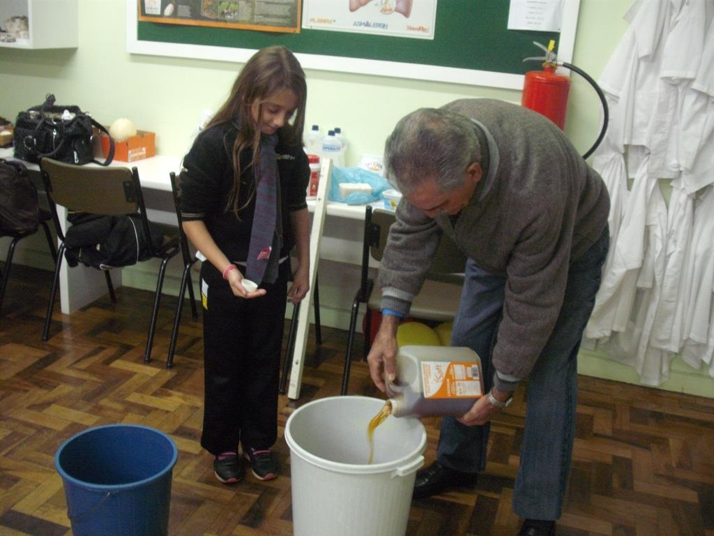 O óleo utilizado na receita foi arrecadado no restaurante da Unidade através de campanha. Na receita do sabão utiliza-se óleo usado, álcool, água e soda cáustica, que foi manuseada apenas pelos adultos presentes: senhor Aristeu e professoras Denise e Letícia de Almeida.