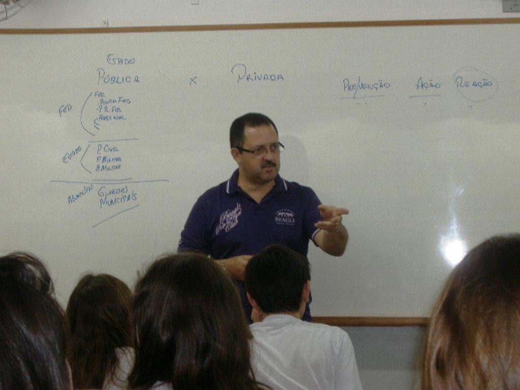 O palestrante falou sobre a diferença entre segurança pública, privada e orgânica esclarecendo as dúvidas dos estudantes. Oliveira falou sobre legislação criminal, sobre os órgãos competentes de cada categoria e suas respectivas atribuições.