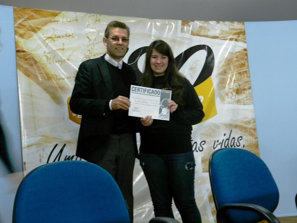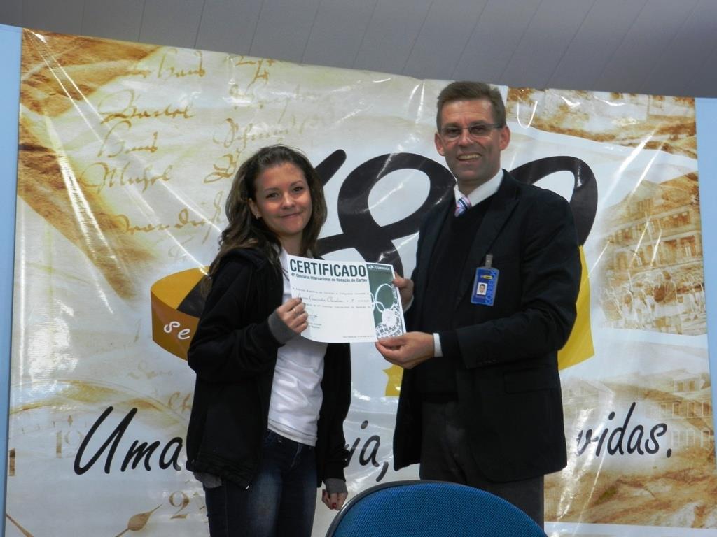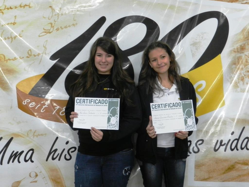 Na manhã de 31 de maio, as estudantes Larissa Grazziotin Claudino e Ana Luiza Pereira Furlanetto da IENH – Unidade Fundação Evangélica receberam a premiação da Etapa Estadual do 41º Concurso Internacional de Redação de Cartas 2012 promovido pelos Correios.