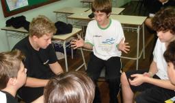 Estudantes da 6ª série da IENH – Unidade Fundação Evangélica participaram de uma atividade musical que explorou os sons corporais. Reunidos em pequenos grupos, com a orientação do professor João Zaqueo Origuella Júnior, os alunos procuraram explorar os sons nas palmas, nos sons da face; engendrando-se com sons das mãos aos sons bocais.