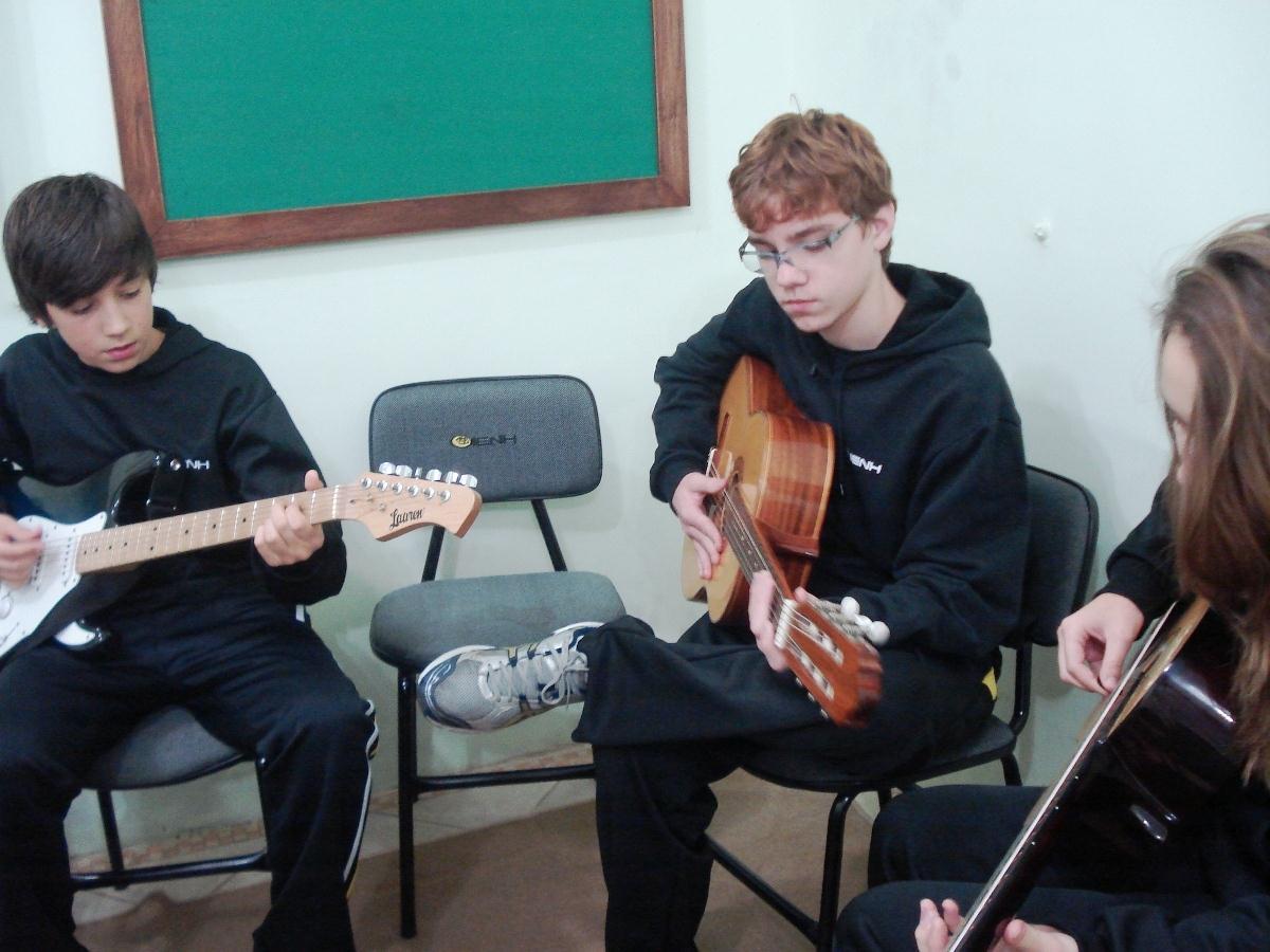 Estudantes da 7ª série B da IENH – Unidade Fundação Evangélica aprenderam nas aulas de música do dia 19 de junho a utilizar o violão, a guitarra e o piano. Segundo o professor João Zaqueo Origuella Júnior, a atividade contribuiu para evidenciar as etapas da aprendizagem musical básica na prática dos instrumentos.