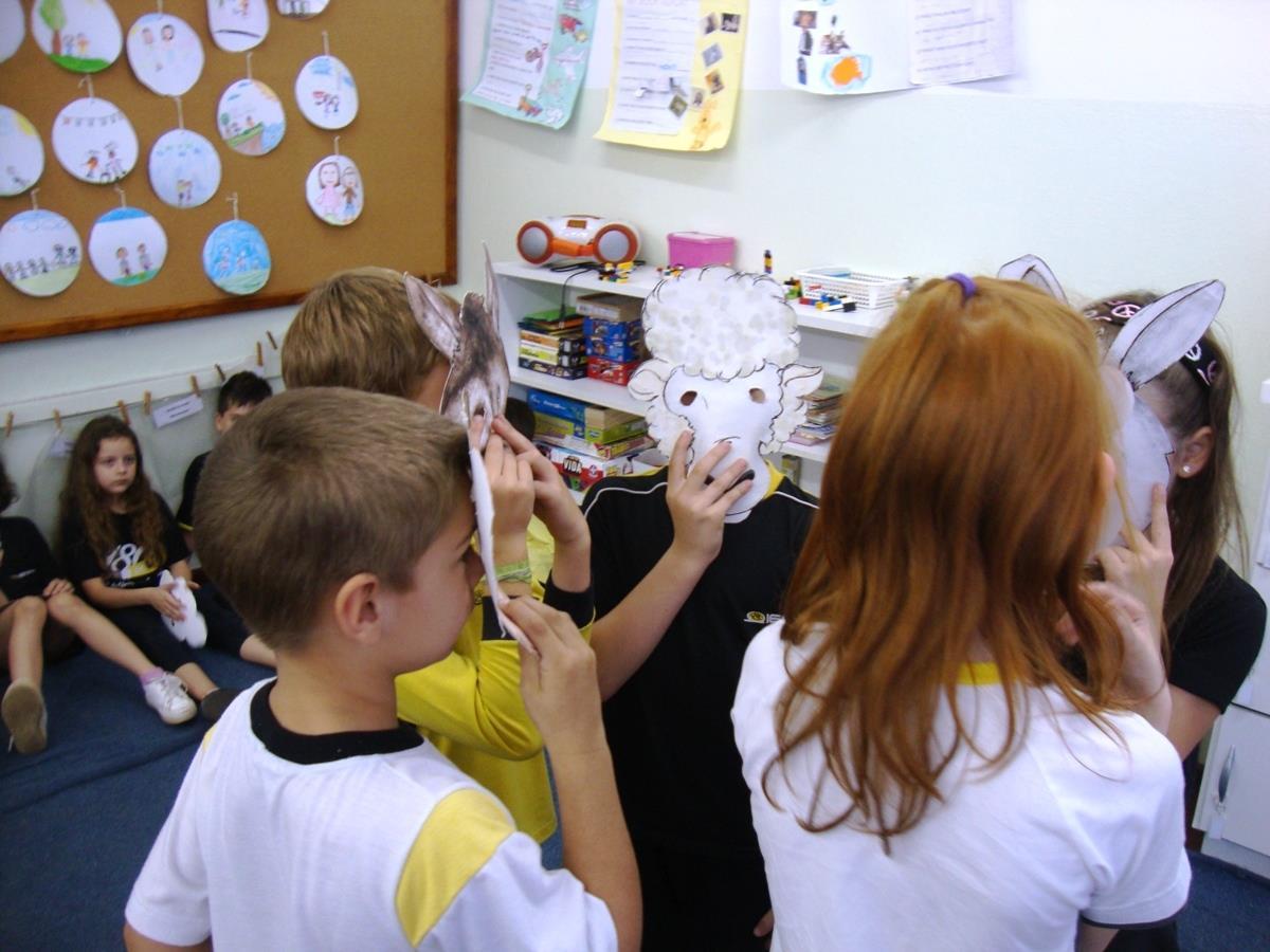 Utilizando máscaras de animais, trabalhando a oralidade e a pronúncia do vocabulário novo, os estudantes organizaram, no dia 23 de agosto, uma dramatização descrevendo as características dos animais.