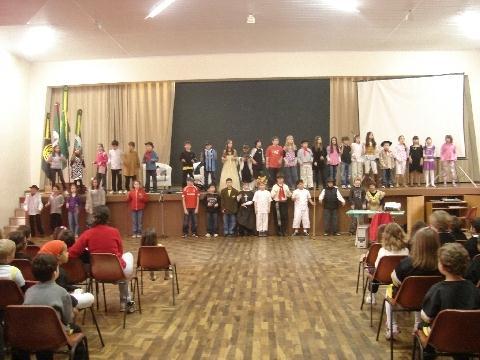 Durante a Sessão Cívica, os alunos encenaram uma peça que mostrou fatos importantes da história do Rio Grande do Sul. Entre os fatos retratados estavam: os tratados de paz, os costumes e a Revolução Farroupilha.