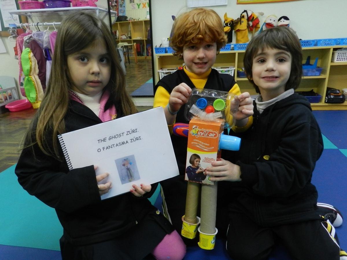 As Professoras de Língua Materna e Língua Inglesa do Nível 5 A da Educação Infantil da IENH – Unidade Oswaldo Cruz, Liliane Bohlke e Giórgia Berwanger, propuseram uma atividade diferente para a turma: criar bonecos de sucata.
