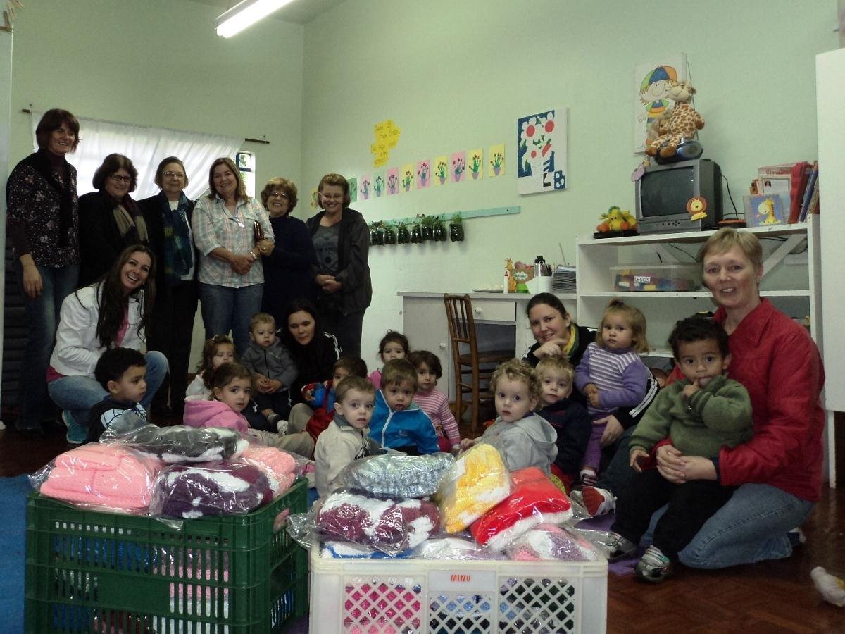 Foram 112 conjuntos de toucas, casacos, meias e calças de tricô entregues na Associação Beneficente Evangélica Floresta Imperial – ABEFI, para os alunos da Educação Infantil (do berçário aos 04 anos).