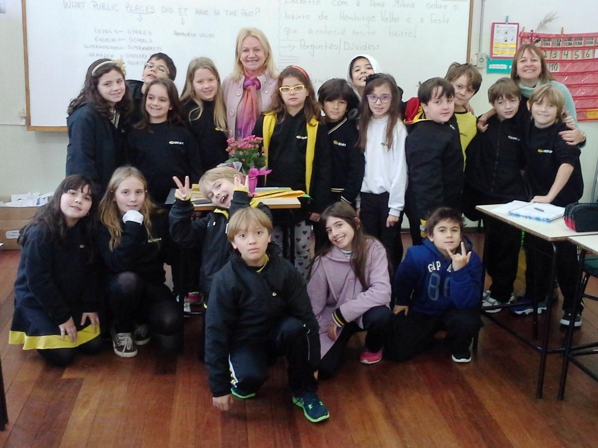 A turma do 3º ano A do Currículo Bilíngue da IENH – Unidade Pindorama recebeu a visita de Milena, que conversou com os estudantes sobre o bairro Hamburgo Velho e a Imigração Alemã, no dia 10 de junho.