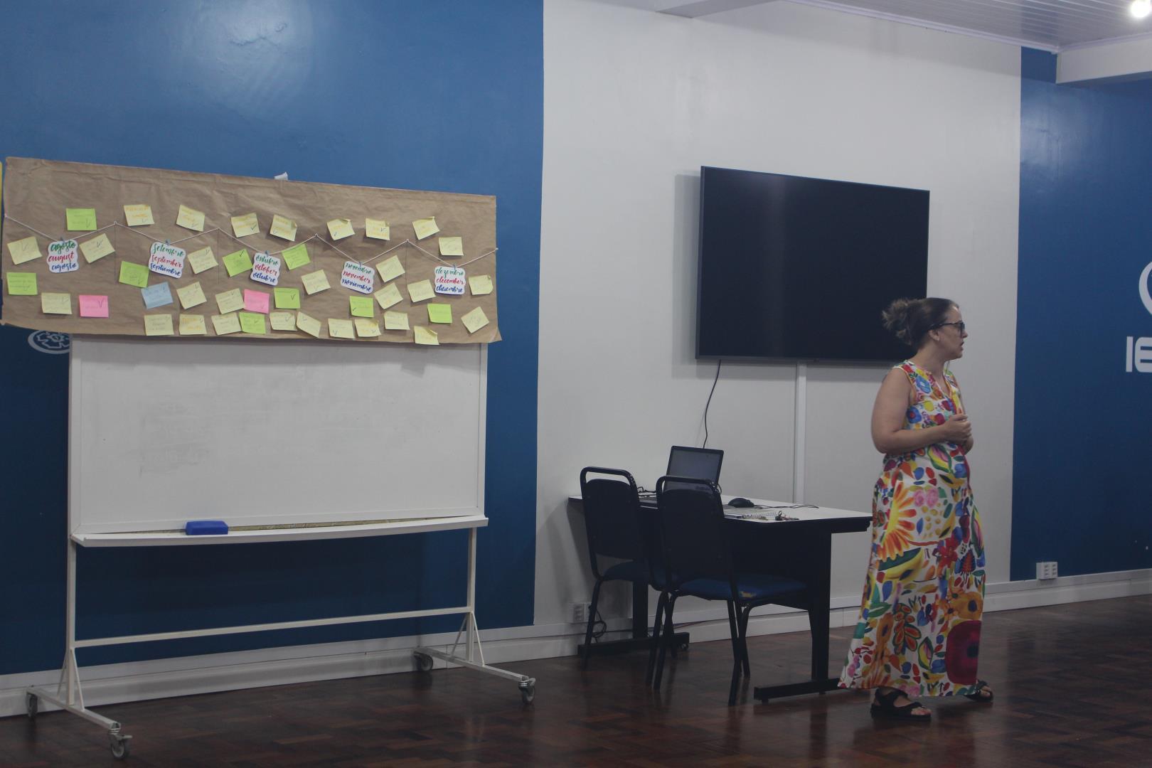 De forma criativa, os professores, organizados em grupos, apresentaram uma sinopse de filme para contar os principais acontecimentos, vivências e atividades desenvolvidas ao longo de 2025. A dinâmica estimulou a troca de ideias, o olhar colaborativo e o reconhecimento das construções realizadas durante o ano.