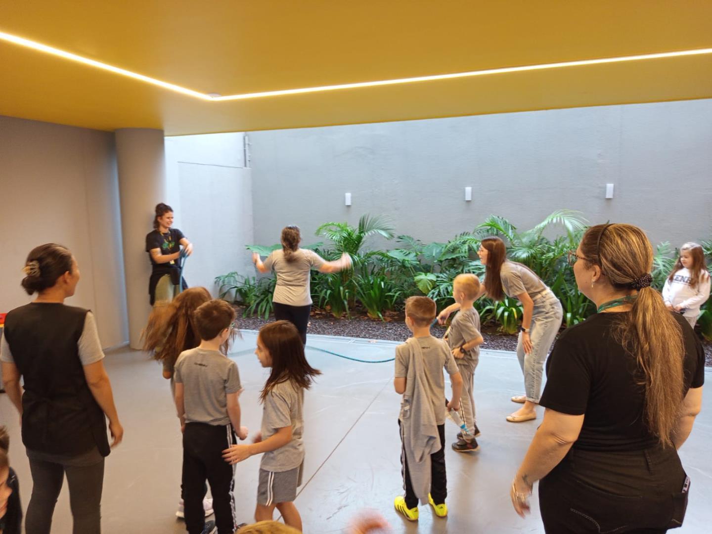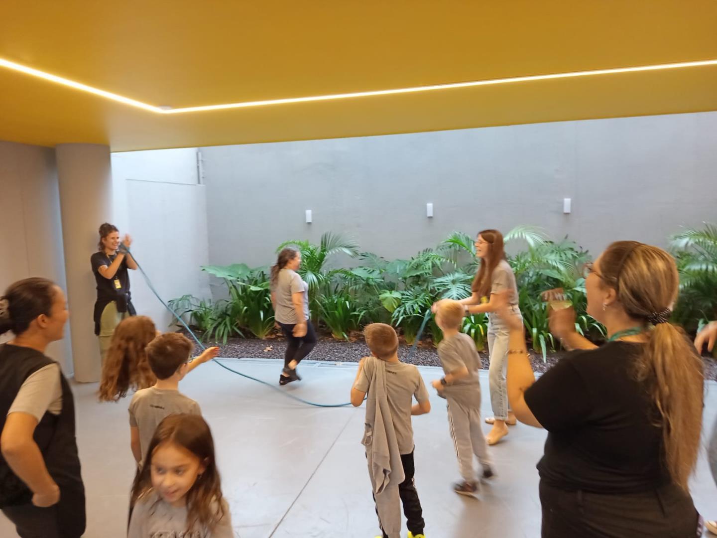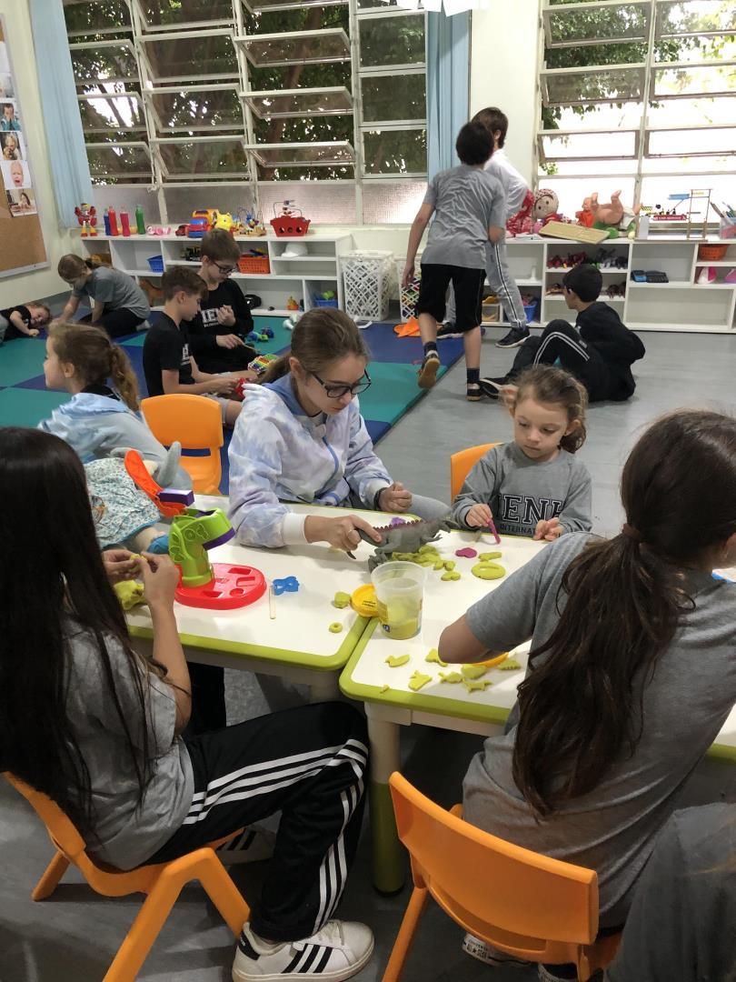 As turmas também exploraram jogos cooperativos como bingo, freeze dance, Simon says (chefe manda), dobradura, cama de gato e o jogo do saci, em experiências que estimularam a criatividade e o trabalho em grupo.