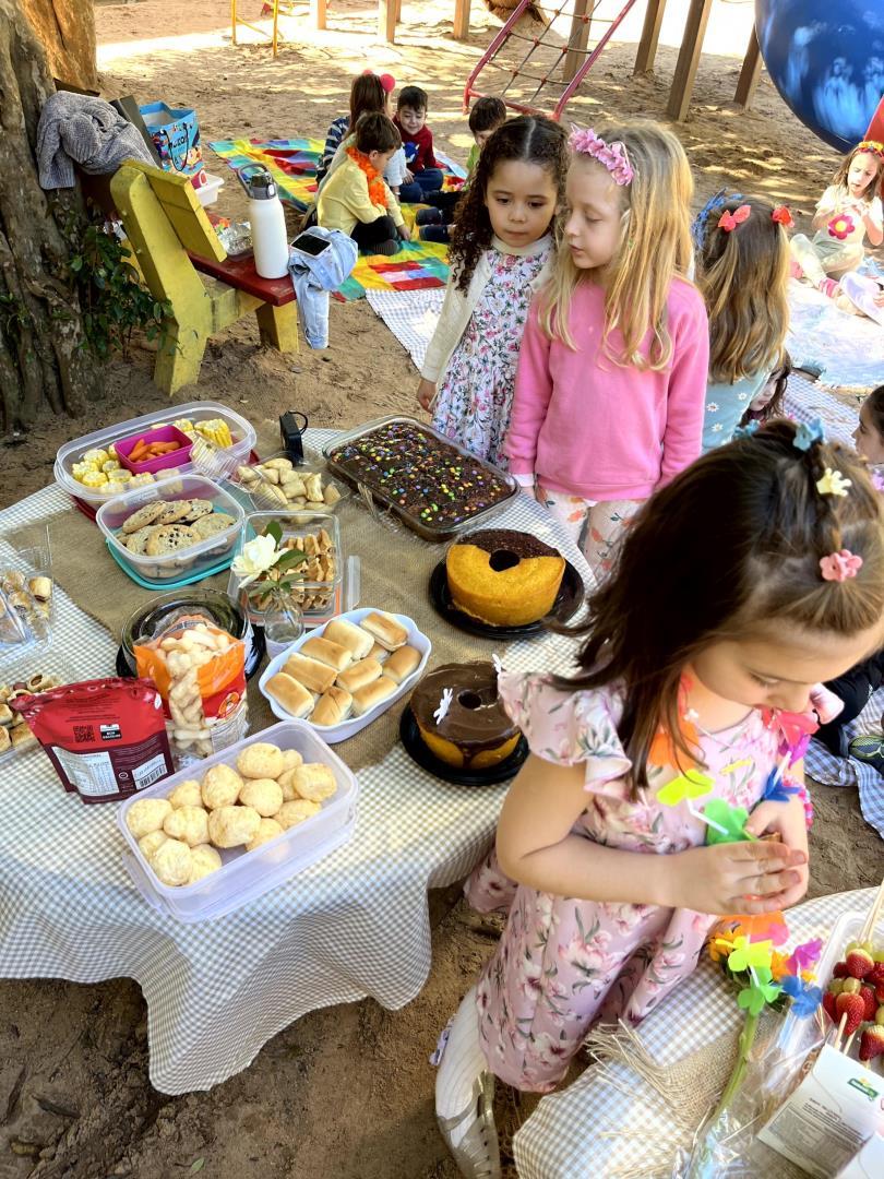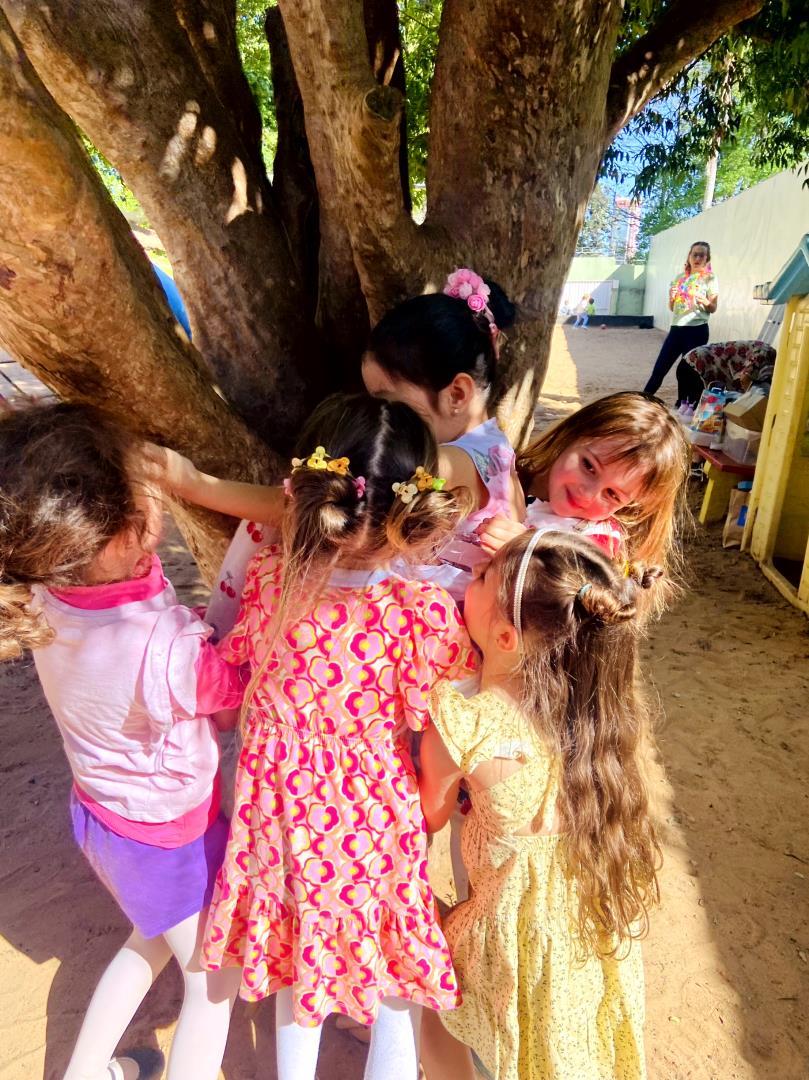Enquanto o Kindergarten 4A estuda os chás e o Kindergarten 4B as árvores, a Spring Party foi pensada para unir esses conhecimentos em um clima de festa e descobertas. Vestidas com roupas coloridas e livres, as crianças exploraram o ambiente, brincaram e compartilharam lanches trazidos de casa, fortalecendo o convívio coletivo.