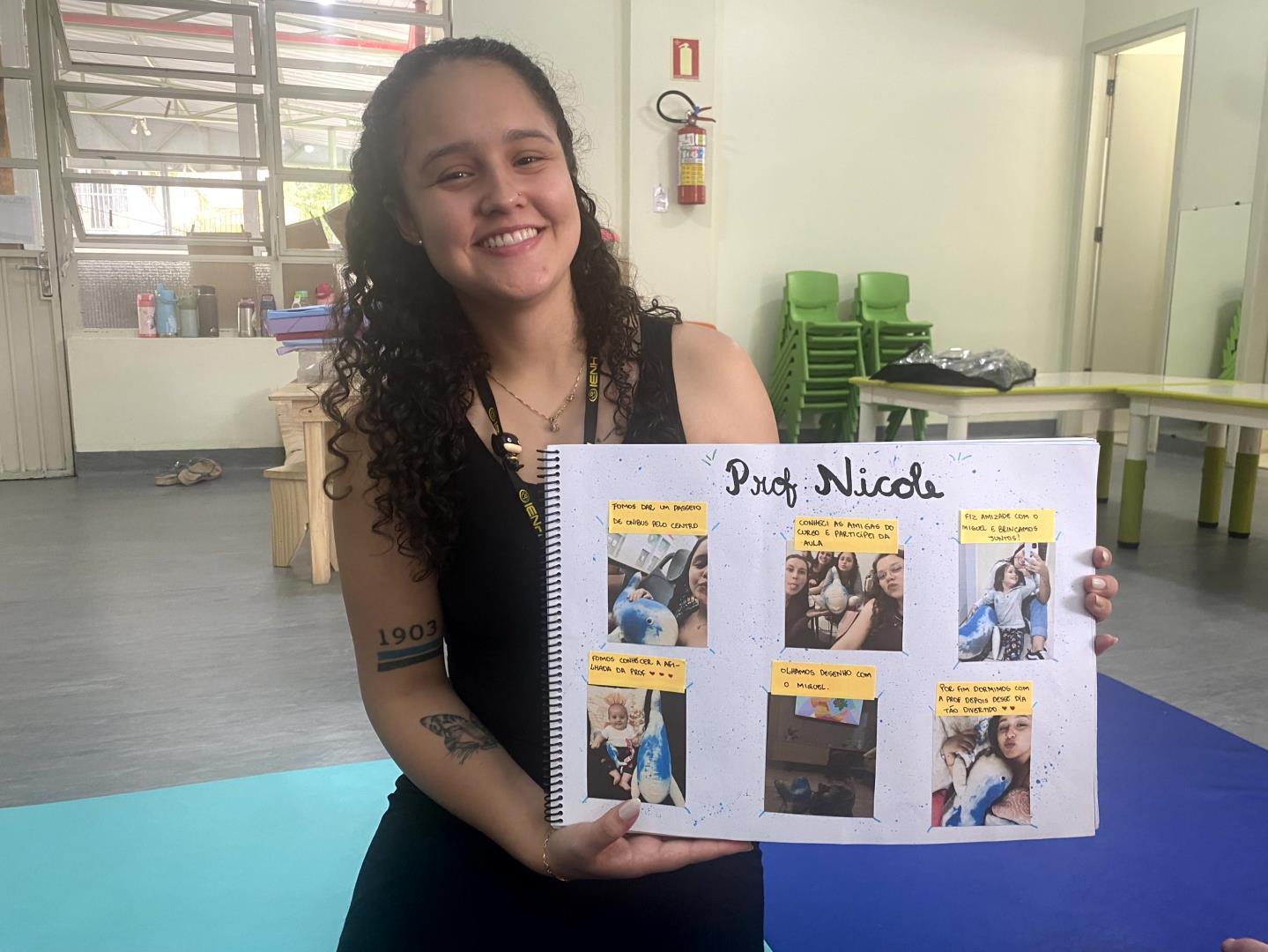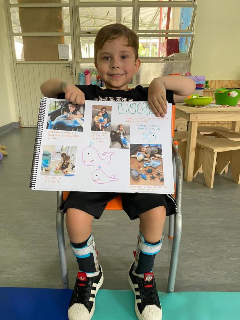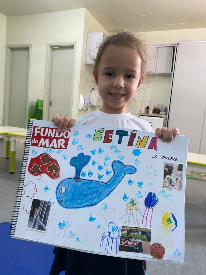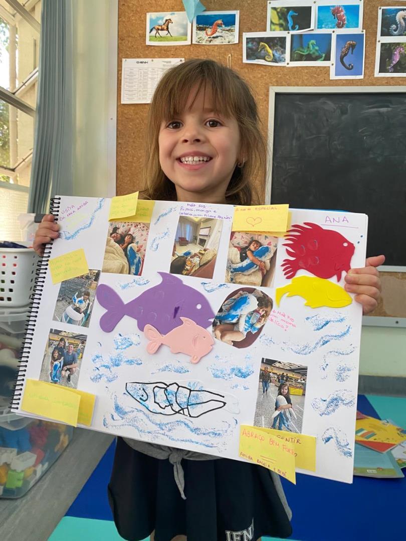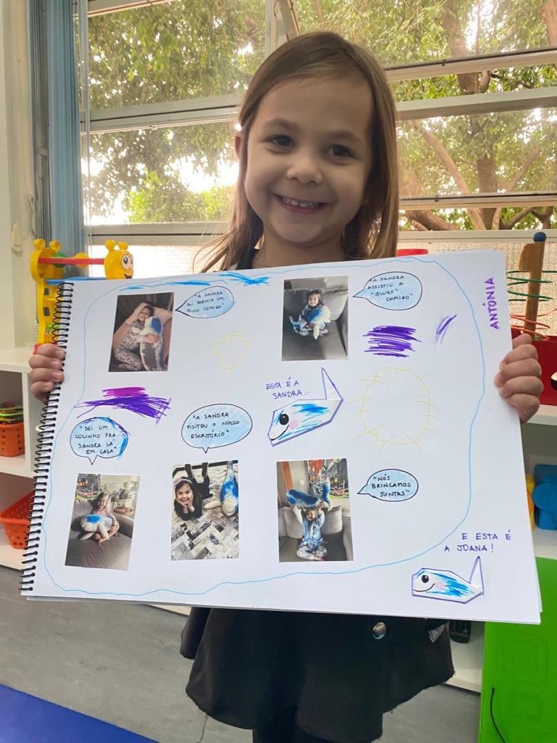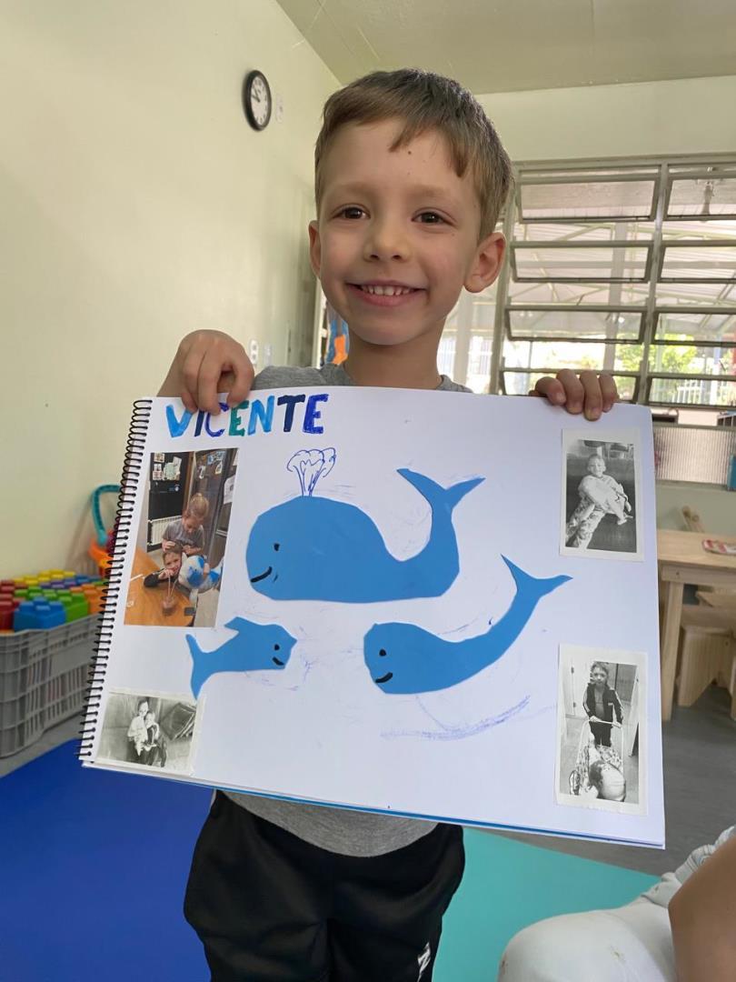 Entre as diversas atividades realizadas, um dos momentos mais marcantes foi a confecção de uma grande baleia e de seu filhote, que se tornaram as mascotes oficiais da turma. Batizadas de Sandra e Joana pelas próprias crianças, as mascotes passaram a fazer parte da rotina escolar e familiar.