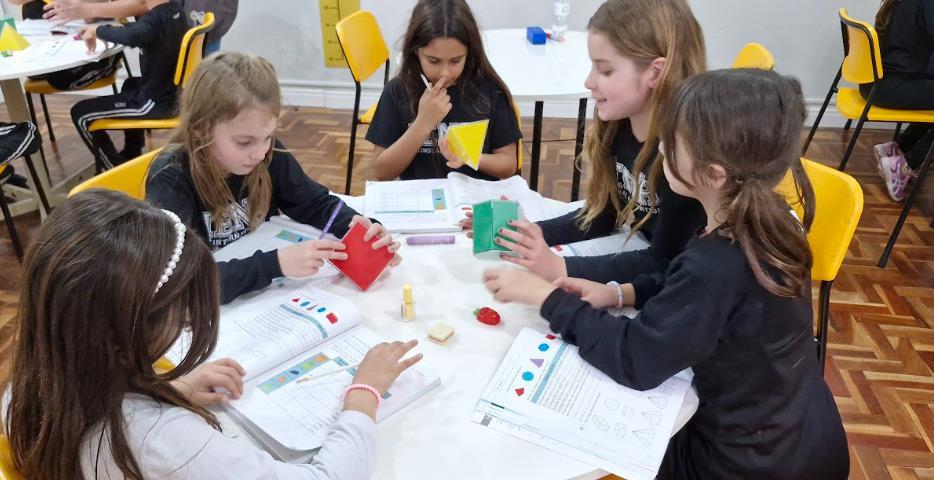 A atividade ultrapassou os limites dos livros e passou a fazer parte do cotidiano dos estudantes, que começaram a identificar e nomear formas, como cylinder, circle, cube, square, sphere, triangle, prism, nos objetos e espaços ao seu redor.