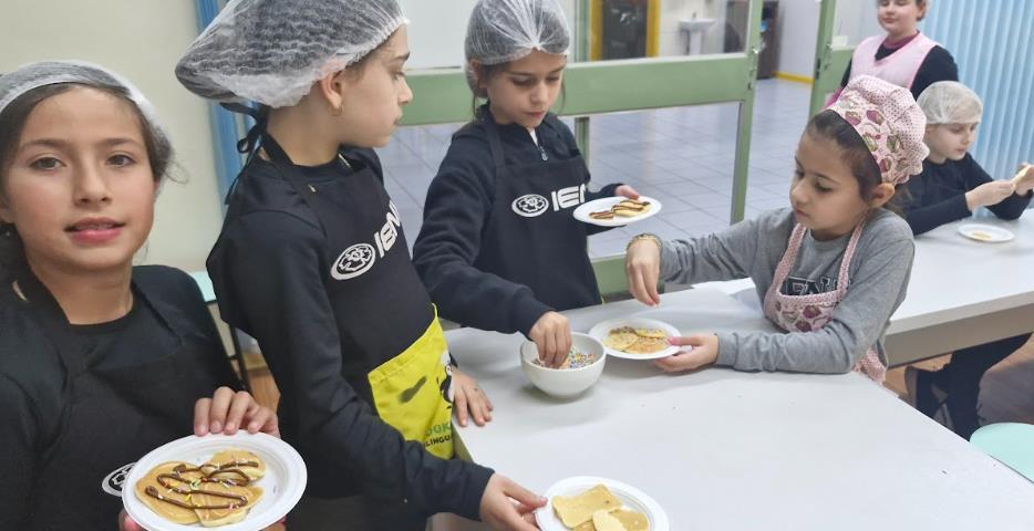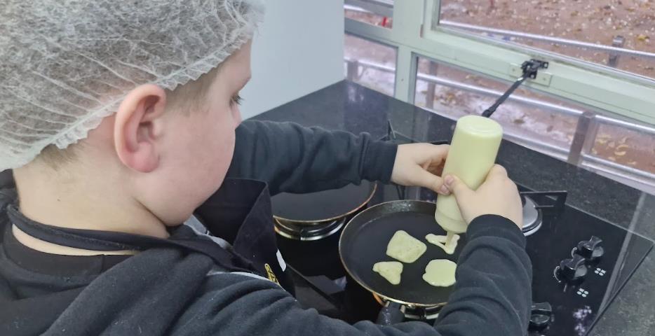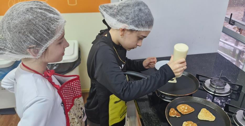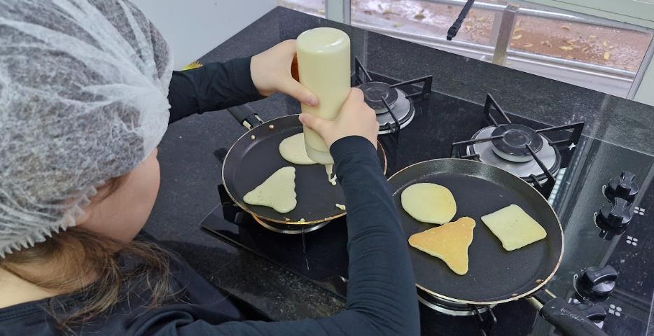 Entre os destaques das atividades práticas está a criação de um "cubo-cartão", construído com dobraduras e oferecido como presente para a figura paterna. Já na aula especial de Cooking Class, os estudantes prepararam deliciosas American pancakes em diferentes formatos geométricos, relacionando as formas planas (2D) com os sólidos geométricos (3D) de maneira saborosa e educativa.