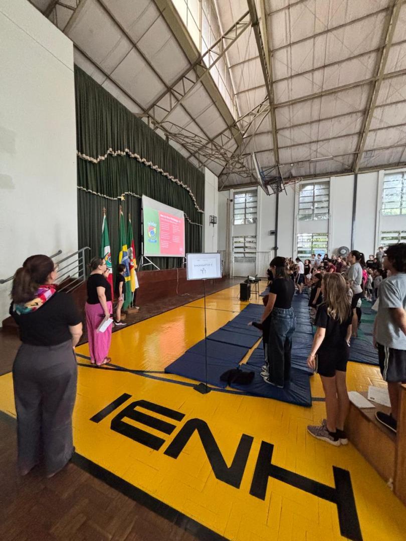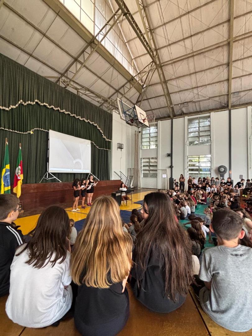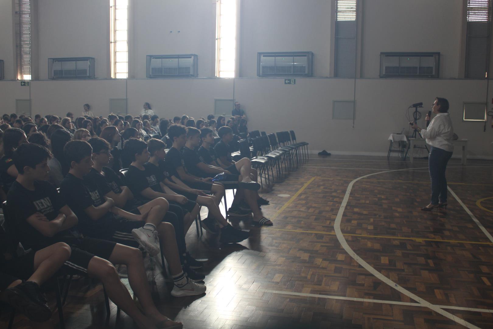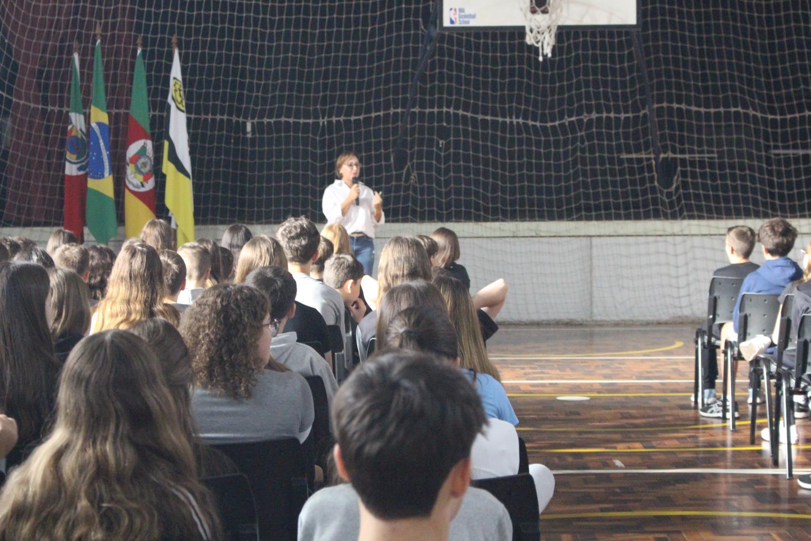 Já na Unidade Fundação Evangélica, a diretora administrativa da Secretaria de Cultura e Turismo de Novo Hamburgo, Amanda Becker, participou da programação com dois momentos no ginásio, voltados aos estudantes do Ensino Fundamental e do Ensino Médio. Durante os encontros, ela compartilhou informações e curiosidades sobre a cidade, destacando o número de praças e as ações desenvolvidas pela Casa das Artes de Novo Hamburgo para a comunidade. Ela também valorizou o museu Dalila Clementina Sperb, personagem histórica relevante na história da IENH, que receberá o acervo do artista Carlão.
