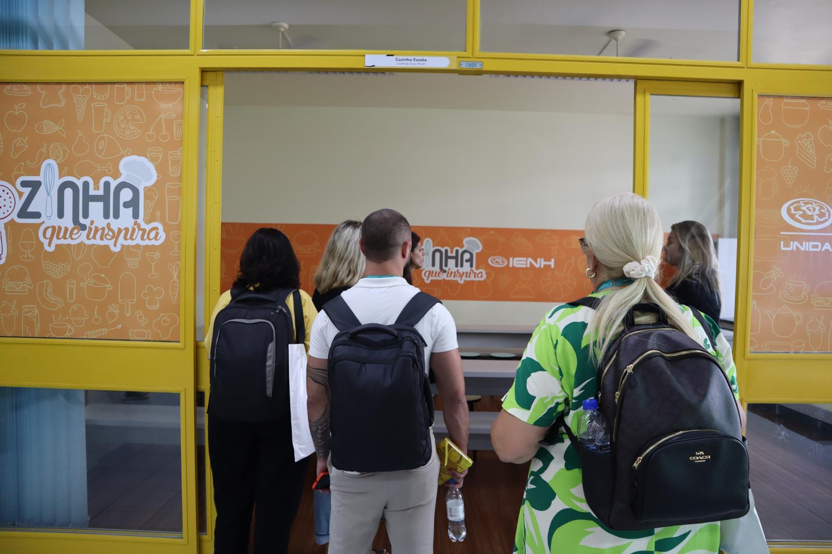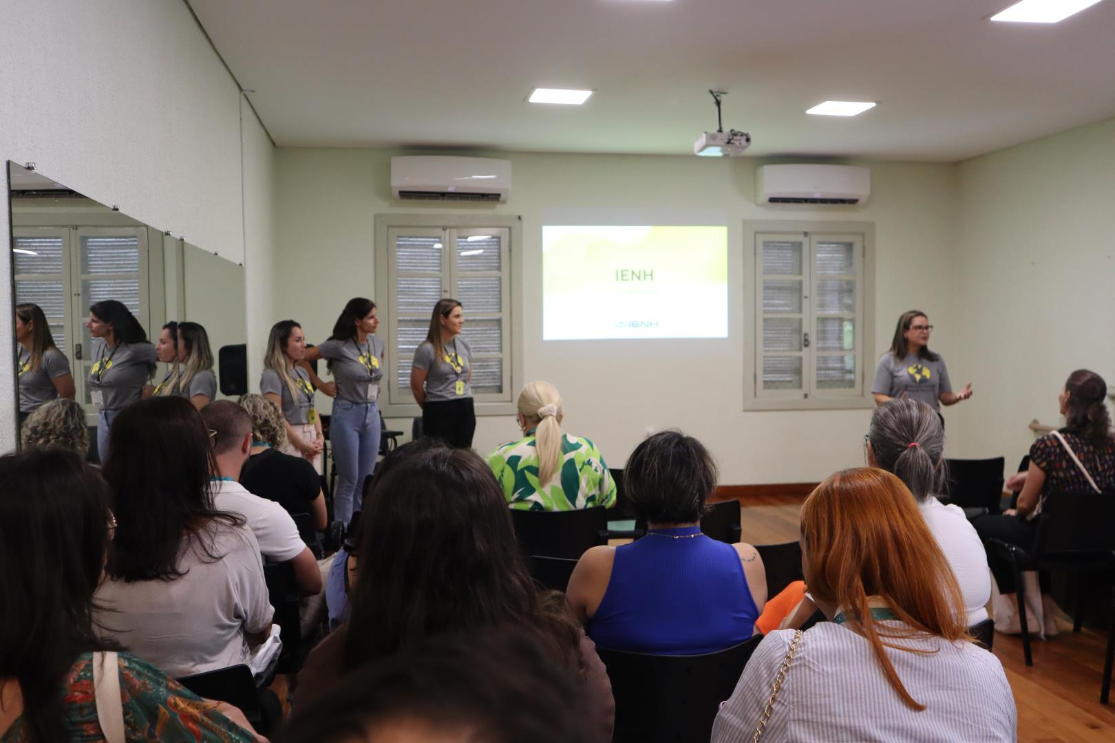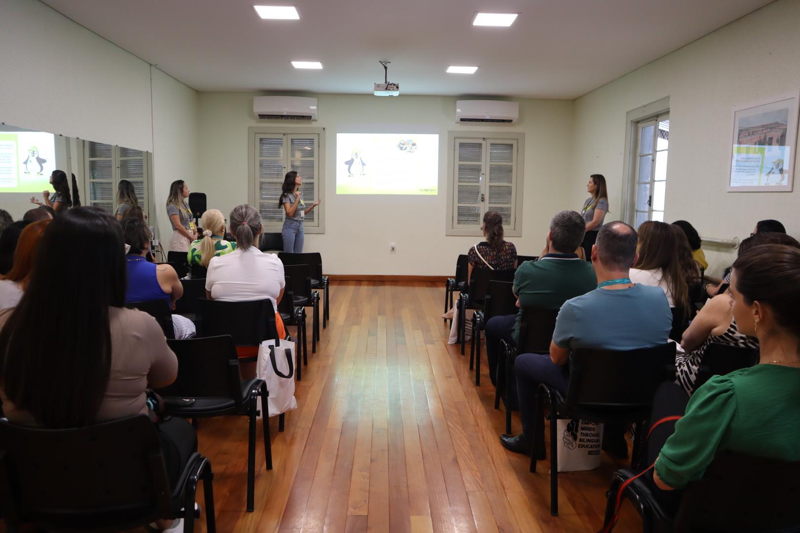 Os visitantes foram recepcionados na Sala Multiuso, onde assistiram a um vídeo institucional e a um tour virtual pela escola. Durante essa primeira etapa, também puderam conhecer um pouco mais sobre a história da IENH, o Currículo Internacional Bilíngue e a organização das aulas.