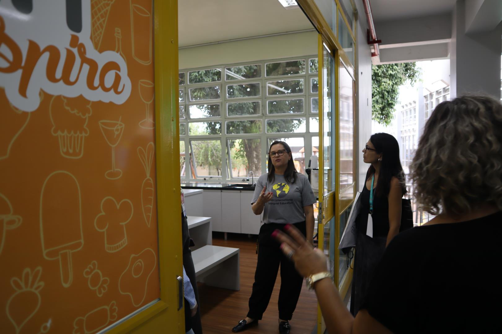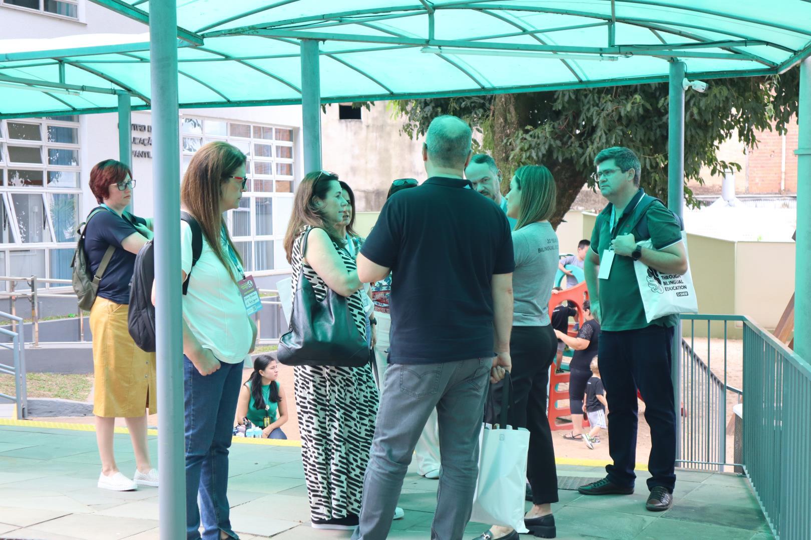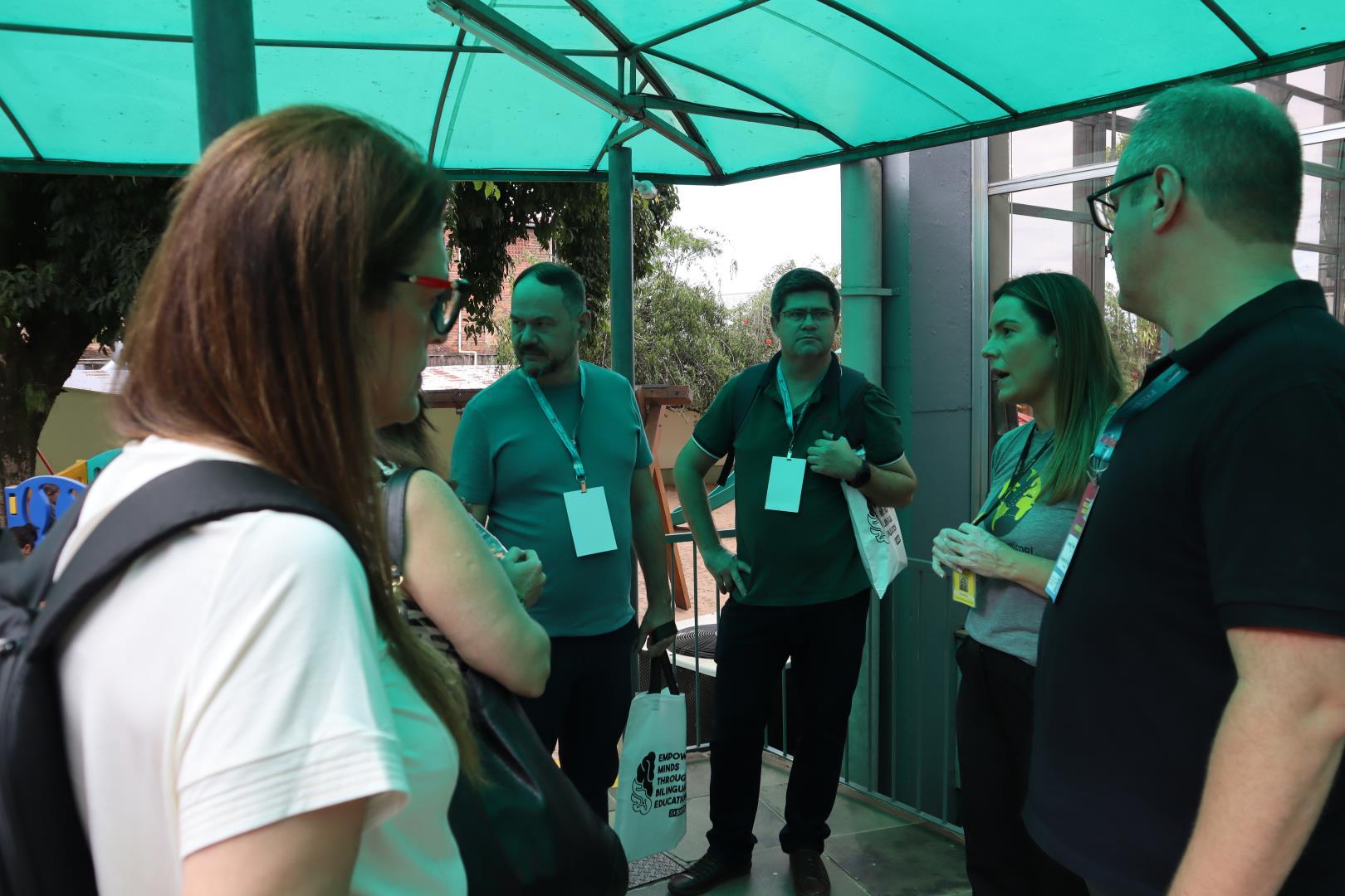 Em seguida, os participantes foram divididos em quatro grupos para um tour presencial pela escola. A visita foi conduzida pela coordenadora da Unidade Pindorama Karina Spessato, pela coordenadora pedagógica do Ensino Fundamental Caroline Steigleder, pela coordenadora pedagógica da Educação Infantil, Aline Baioto Lunkes, e pela assessora do Currículo Internacional Bilíngue Fernanda Andrioli.