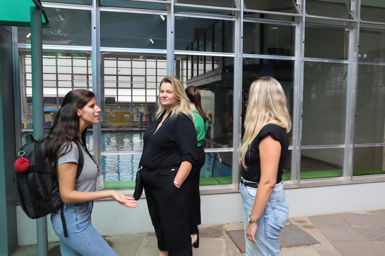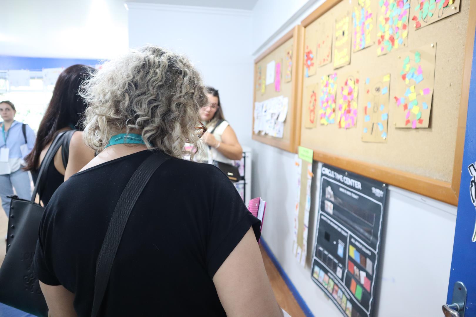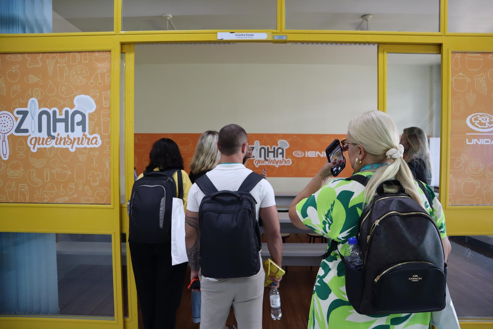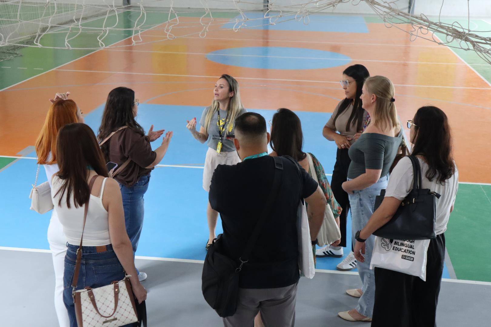 Em seguida, os participantes foram divididos em quatro grupos para um tour presencial pela escola. A visita foi conduzida pela coordenadora da Unidade Pindorama Karina Spessato, pela coordenadora pedagógica do Ensino Fundamental Caroline Steigleder, pela coordenadora pedagógica da Educação Infantil, Aline Baioto Lunkes, e pela assessora do Currículo Internacional Bilíngue Fernanda Andrioli.