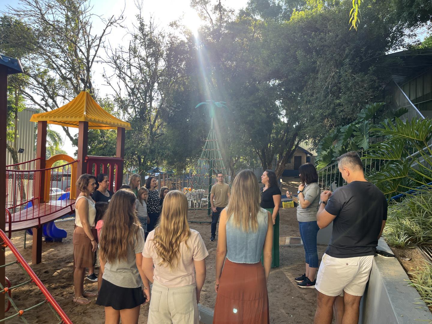 No meio da manhã, um momento coletivo de integração reuniu todas as turmas da escola, desde a Educação Infantil ao Ensino Fundamental do Currículo Internacional Bilíngue, em um grande piquenique, promovendo a convivência entre as famílias.
