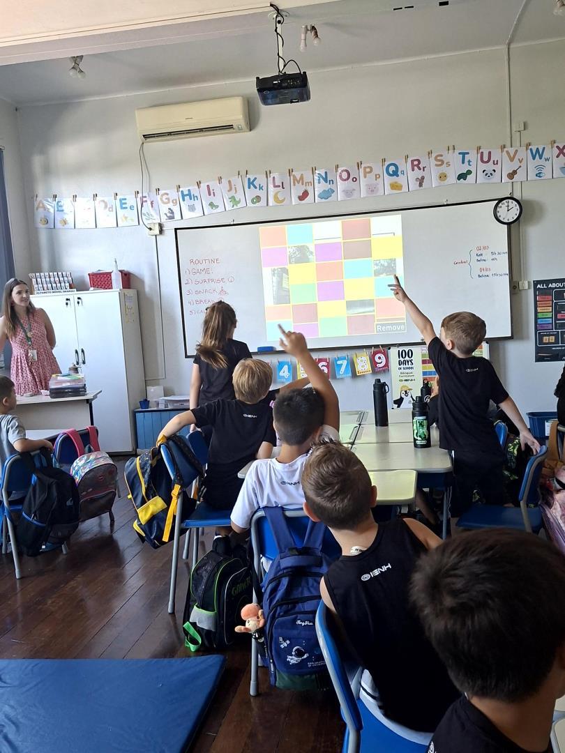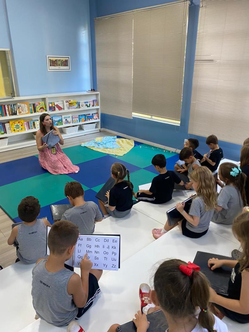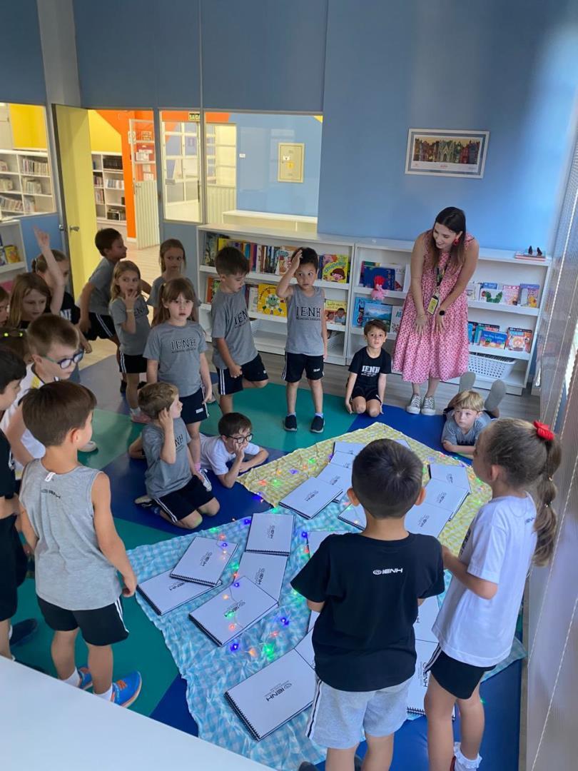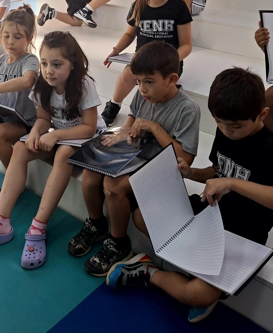 As turmas do Year 1 do Ensino Fundamental do Currículo Internacional Bilíngue da IENH – Unidade Pindorama participaram de uma atividade especial durante a aula de Língua Inglesa, que uniu jogos, colaboração e uma divertida caça ao tesouro. A proposta teve como objetivo ampliar o repertório linguístico dos estudantes, promover uma tarefa colaborativa e apresentar, de forma lúdica, um material importante para a rotina do Ensino Fundamental: os primeiros cadernos.