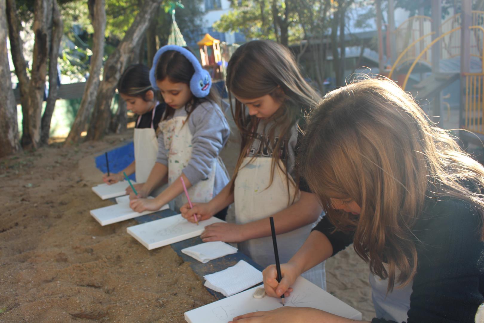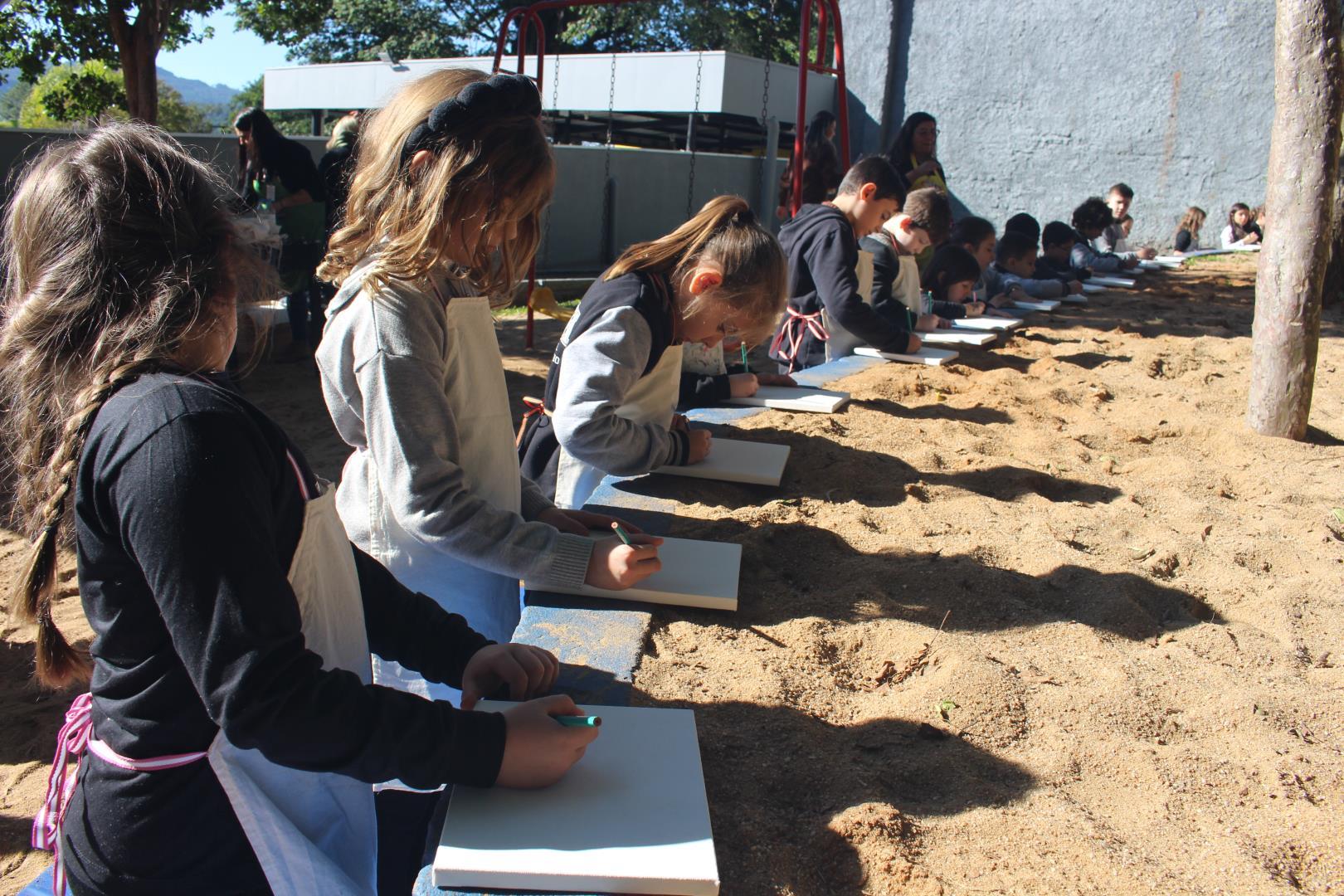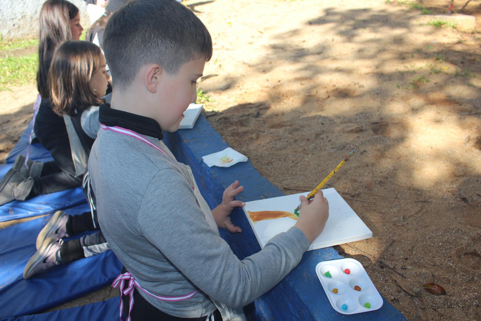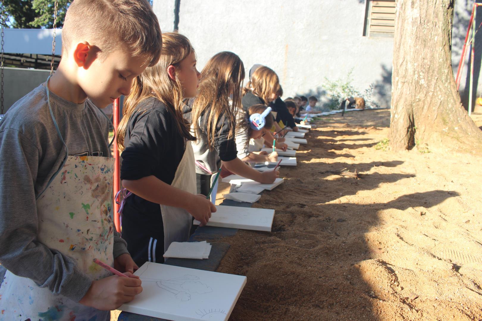 A atividade aconteceu ao ar livre, no pátio Florestinha, onde o ambiente natural se misturou ao processo criativo. “Foi um momento de liberdade artística em contato com a natureza”, destacou a professora Daiane.